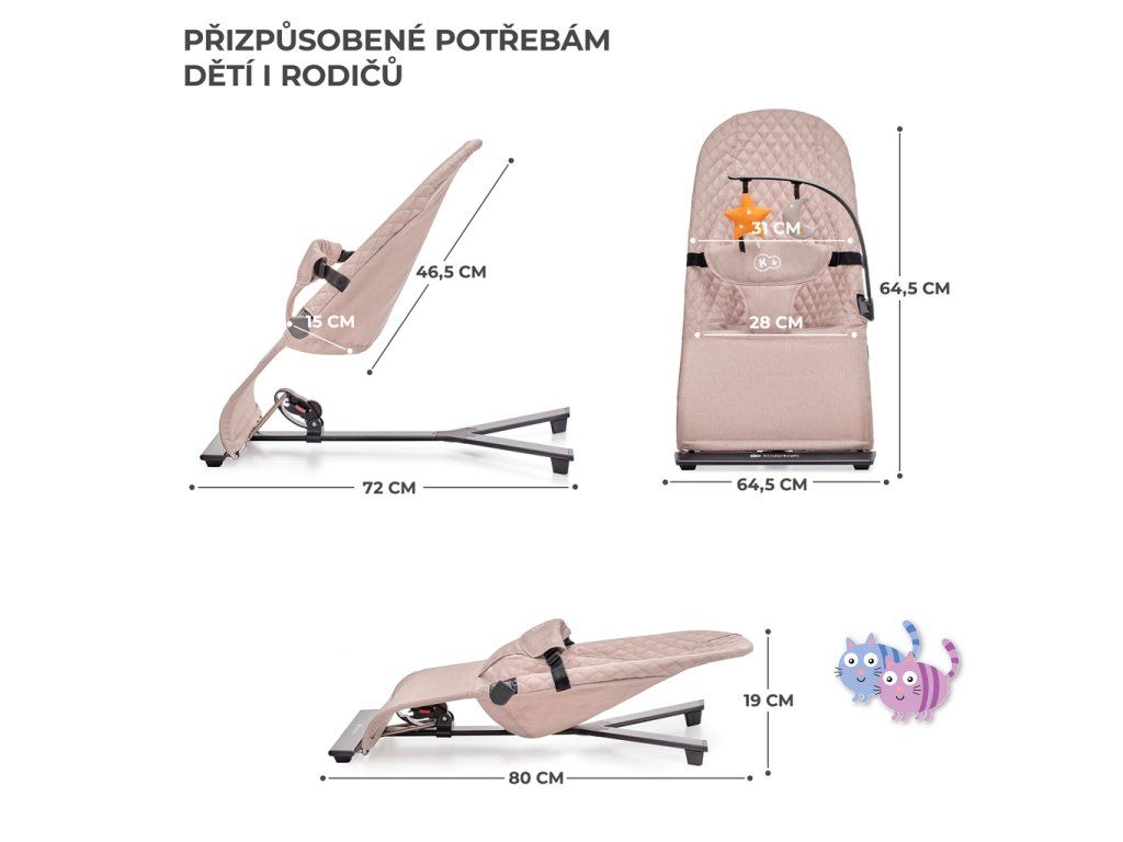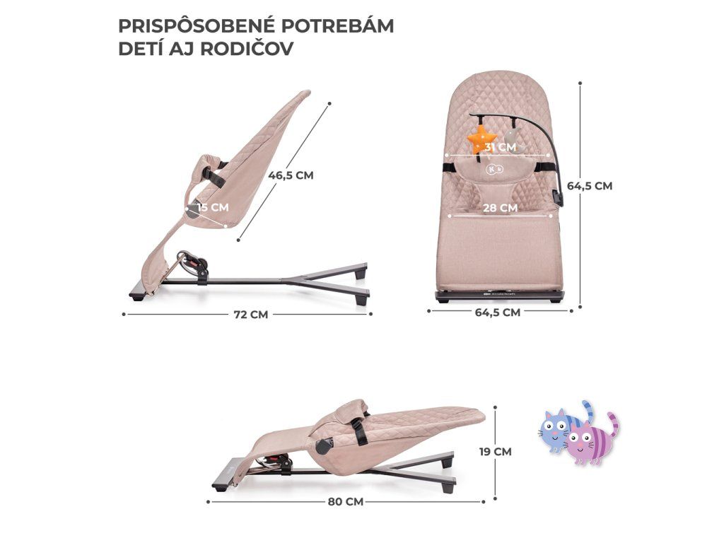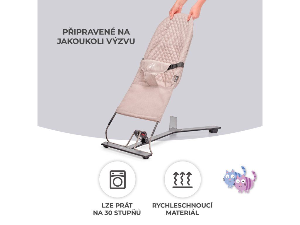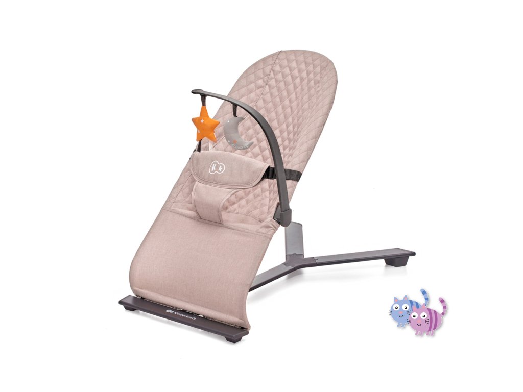Lehátko MIMI přináší čistý minimalismus, uzavřený v překrásné formě. Je to bezpečí, pohodlí a elegance v jednom. Pomůže zklidnit Vaše dítě i během velmi neklidných dnů a zároveň jej nebude příliš stimulovat. A když si bude chtít hrát – bude mít k dispozici 2 závěsné hračky. Žádná světýlka ani hlasité zvuky. Díky třístupňovému nastavení opěradla lehátko snadno přizpůsobíte potřebám dítěte. Ideálně uzpůsobená sedačka z příjemné látky rovnoměrně rozkládá váhu dítěte a podporuje přirozenou polohu během odpočinku.