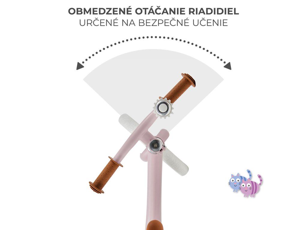 - Tříkolka FLY PLUS má omezený úhel otáčení řidítek, což zabraňuje náhlému a nebezpečnému otáčení během rychlé jízdy.