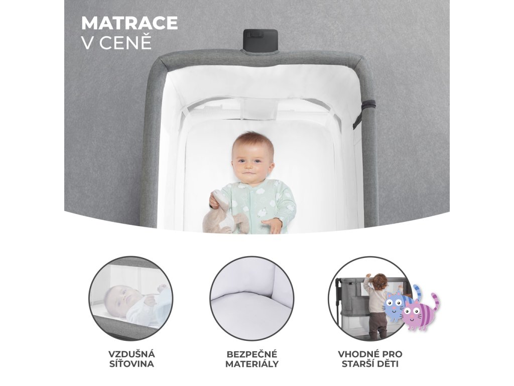 - Ve funkci přistýlky se na straně spuštěné bočnice nachází síťka. Díky tomu můžete mít dítě vždy na očích.