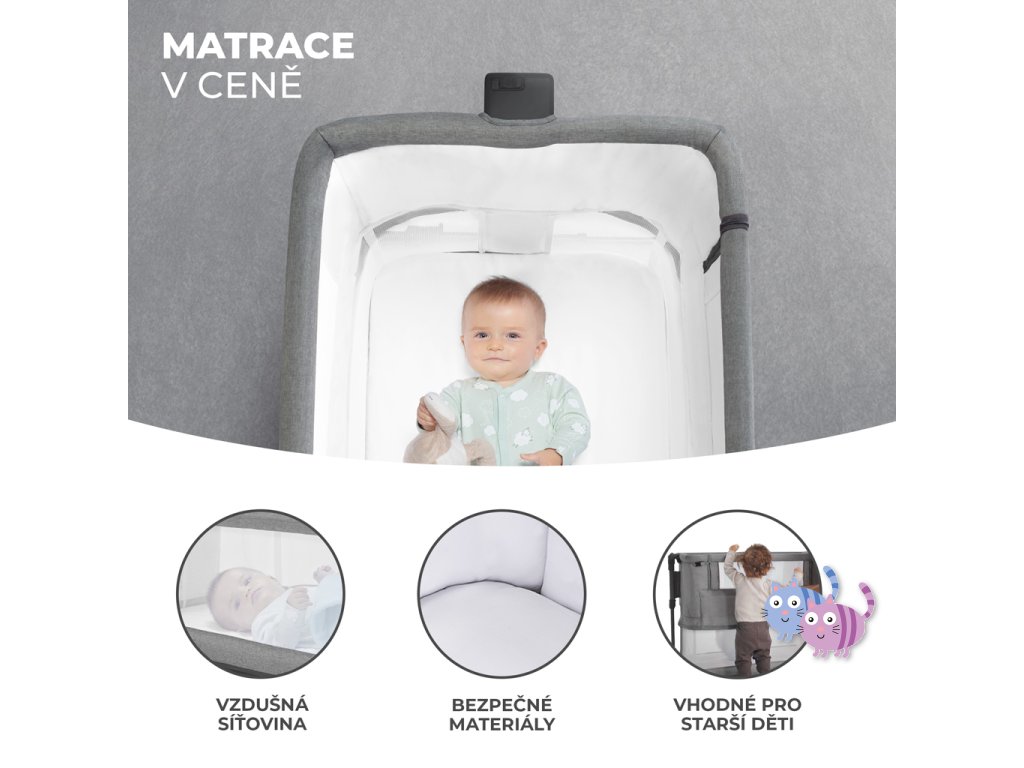 - Ve funkci přistýlky se na straně spuštěné bočnice nachází síťka. Díky tomu můžete mít dítě vždy na očích.