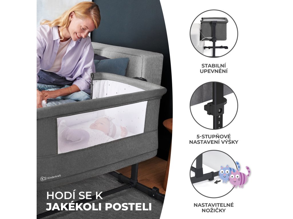 Děti potřebují teplo a blízkost rodičů – jejich potřeba bezpečí se zvyšuje zejména v noci. Ve společnosti Kinderkraft víme, jak to skloubit s potřebou pohodlného spánku. Přístavná postýlka NESTE GROW je víc než jen klasická přistýlka. Je to multifunkční postýlka, která slouží současně jako dětská postýlka, přistýlka a samostatná postýlka pro dvouleté dítě.