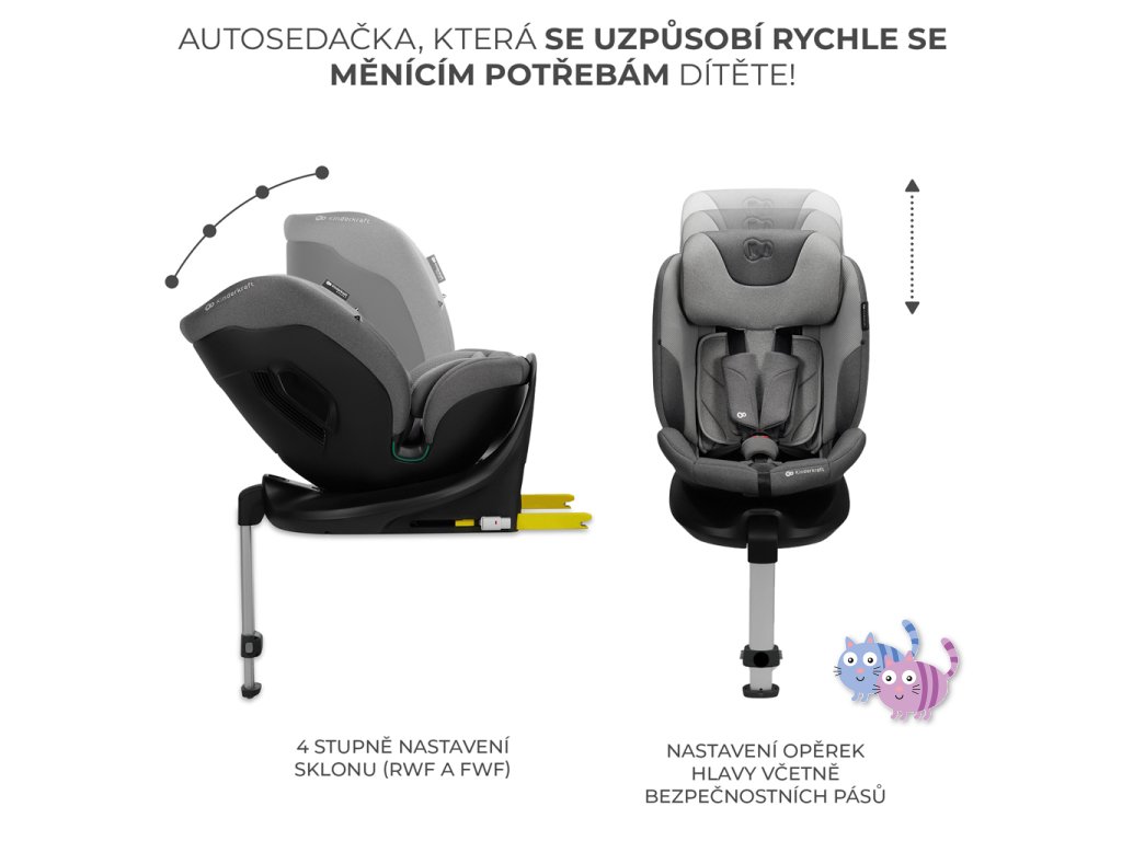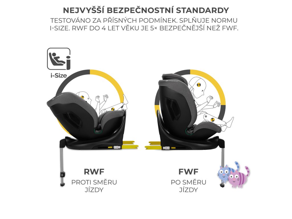 Systém EASY SPIN 360° umožňuje pohodlné otáčení sedadla kolem vlastní osy. Umožní vám nejen pohodlnější vyndávání dítěte z auta (stačí otočit sedačku proti dveřím) nebo jeho připoutání pomocí 5bodového vnitřního bezpečnostního pásu, ale také rychlou změnu z polohy RWF do polohy FWF, aniž by bylo nutné demontovat celou sedačku.