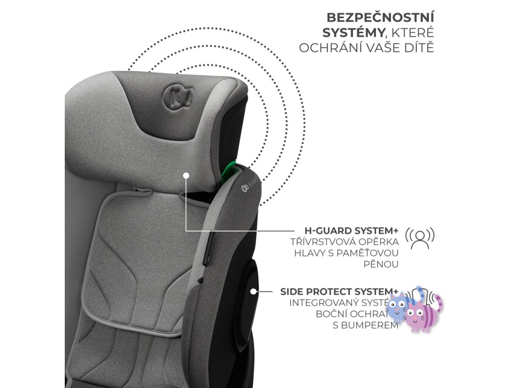 Sedačka je vybavena 2 systémy, které zajišťují bezpečnost cestování na nejvyšší úrovni. H-GUARD+ je zesílená třívrstvá opěrka hlavy s dodatečnou pěnou. Tato konstrukce chrání hlavu a krční část páteře, protože ještě lépe absorbuje energii vznikající při nárazu, a zároveň zvyšuje pohodlí jízdy tím, že se přizpůsobuje individuálnímu tvaru hlavy dítěte. Systém SPS+ je naopak vylepšený systém boční ochrany - potahy byly doplněny o nárazníky, které se chovají jako deformační zóna ve voze a dále zpevňují konstrukci sedačky v klíčových bodech. Převezmou na sebe první a nejsilnější sílu nárazu, rozptýlí ji a udrží mimo tělo dítěte.