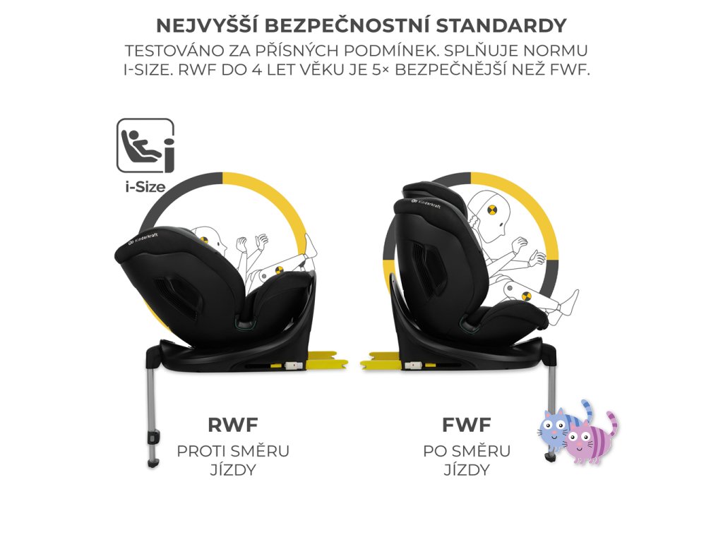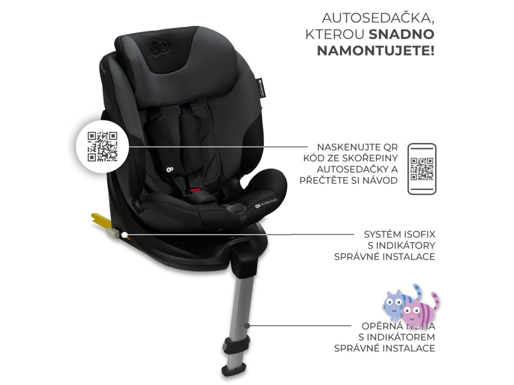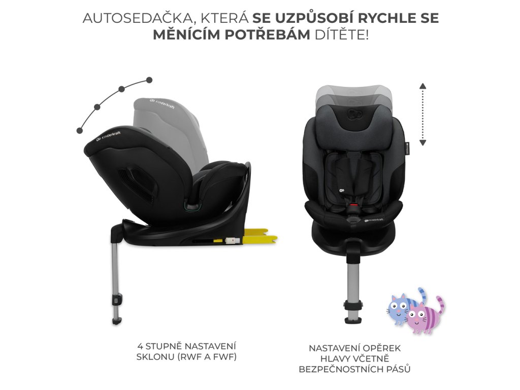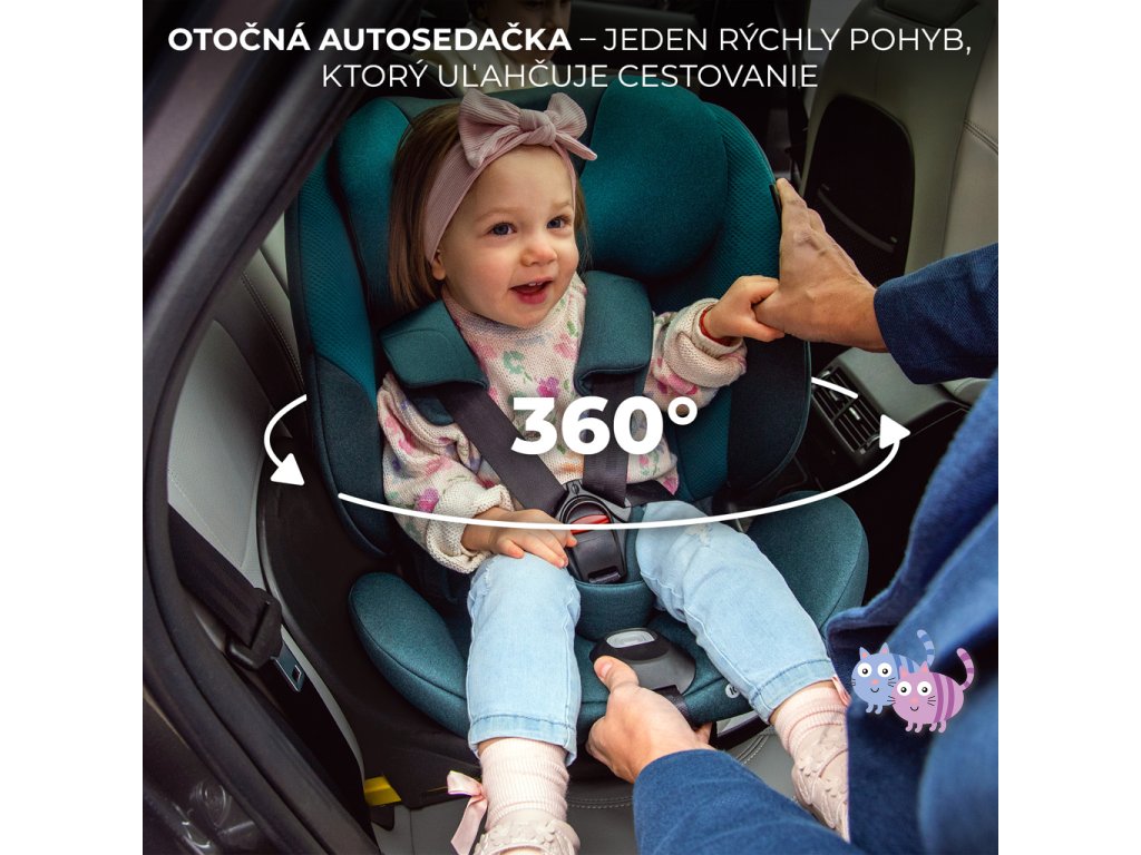 Systém EASY SPIN 360° umožňuje pohodlné otáčení sedadla kolem vlastní osy. Umožní vám nejen pohodlnější vyndávání dítěte z auta (stačí otočit sedačku proti dveřím) nebo jeho připoutání pomocí 5bodového vnitřního bezpečnostního pásu, ale také rychlou změnu z polohy RWF do polohy FWF, aniž by bylo nutné demontovat celou sedačku.