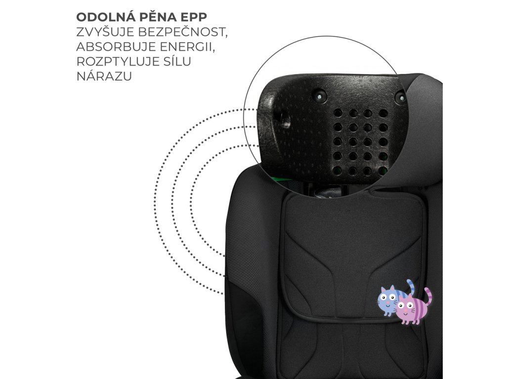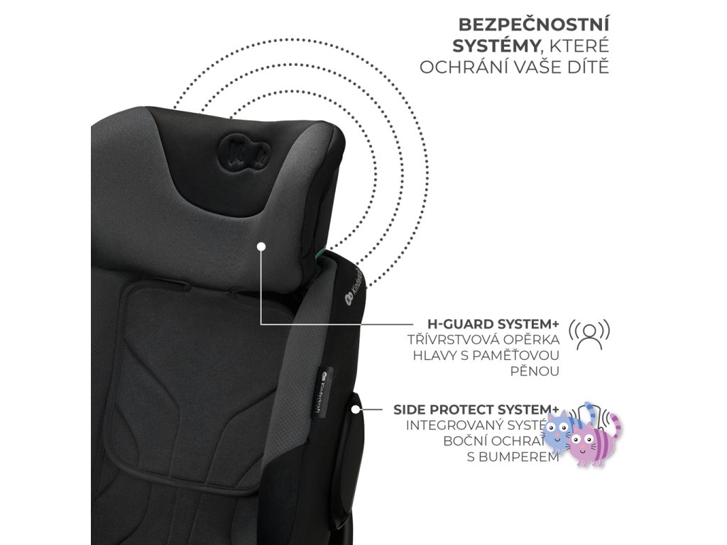 Sedačka je vybavena 2 systémy, které zajišťují bezpečnost cestování na nejvyšší úrovni. H-GUARD+ je zesílená třívrstvá opěrka hlavy s dodatečnou pěnou. Tato konstrukce chrání hlavu a krční část páteře, protože ještě lépe absorbuje energii vznikající při nárazu, a zároveň zvyšuje pohodlí jízdy tím, že se přizpůsobuje individuálnímu tvaru hlavy dítěte. Systém SPS+ je naopak vylepšený systém boční ochrany - potahy byly doplněny o nárazníky, které se chovají jako deformační zóna ve voze a dále zpevňují konstrukci sedačky v klíčových bodech. Převezmou na sebe první a nejsilnější sílu nárazu, rozptýlí ji a udrží mimo tělo dítěte.