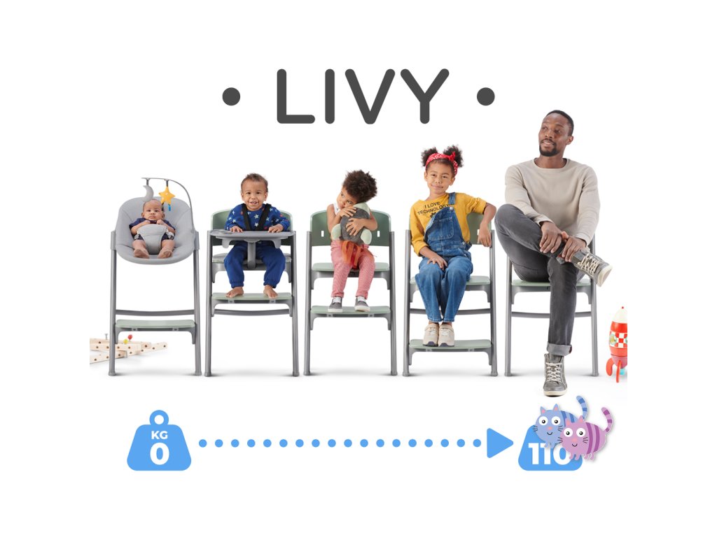 Židlička LIVY bude vaše dítě doprovázet v každé fázi života. Plní hned 4 funkce: je to vysoké lehátko, originální jídelní židlička a židlička pro předškoláka i dospělého v jednom – až do hmotnosti 110 kg možného zatížení! Podporuje vývoj dítěte začínaje od prvních chvil doma v lehátku, přes snahu samostatně jíst na židličce, až po rozvíjení vášně u prvního psacího stolu konče.