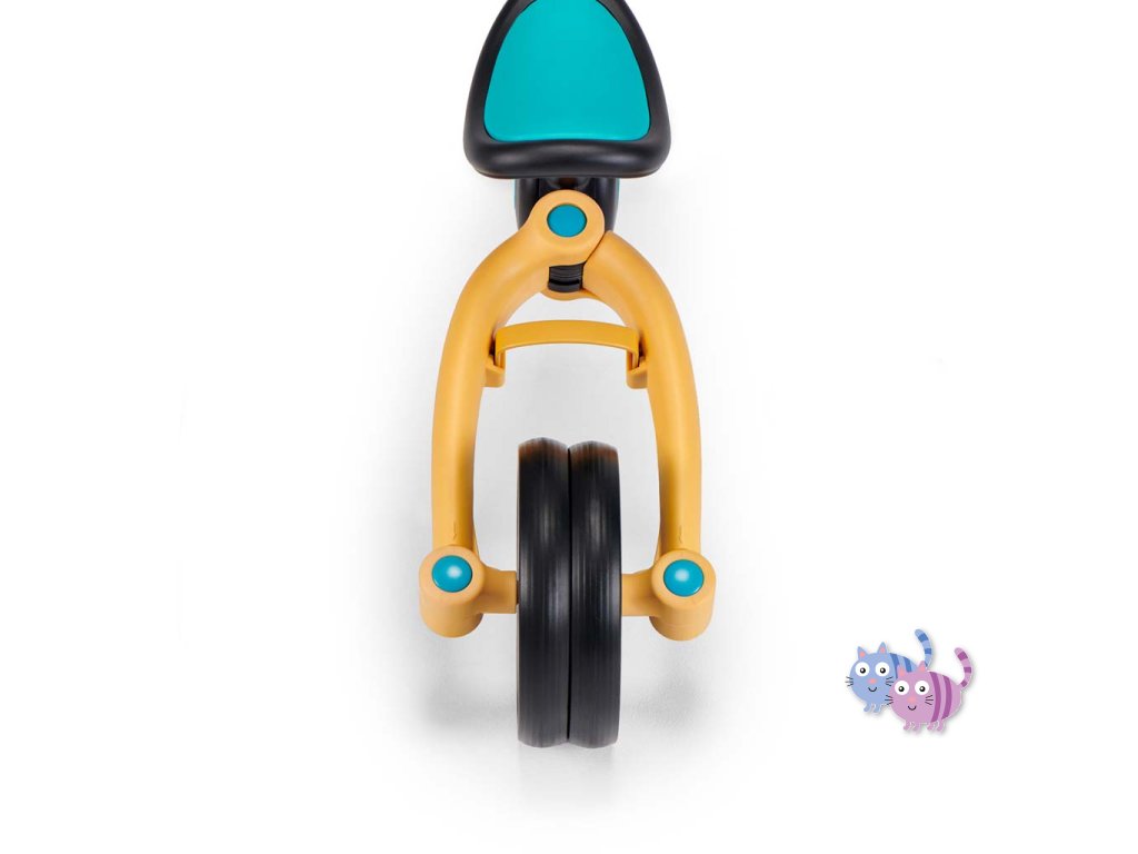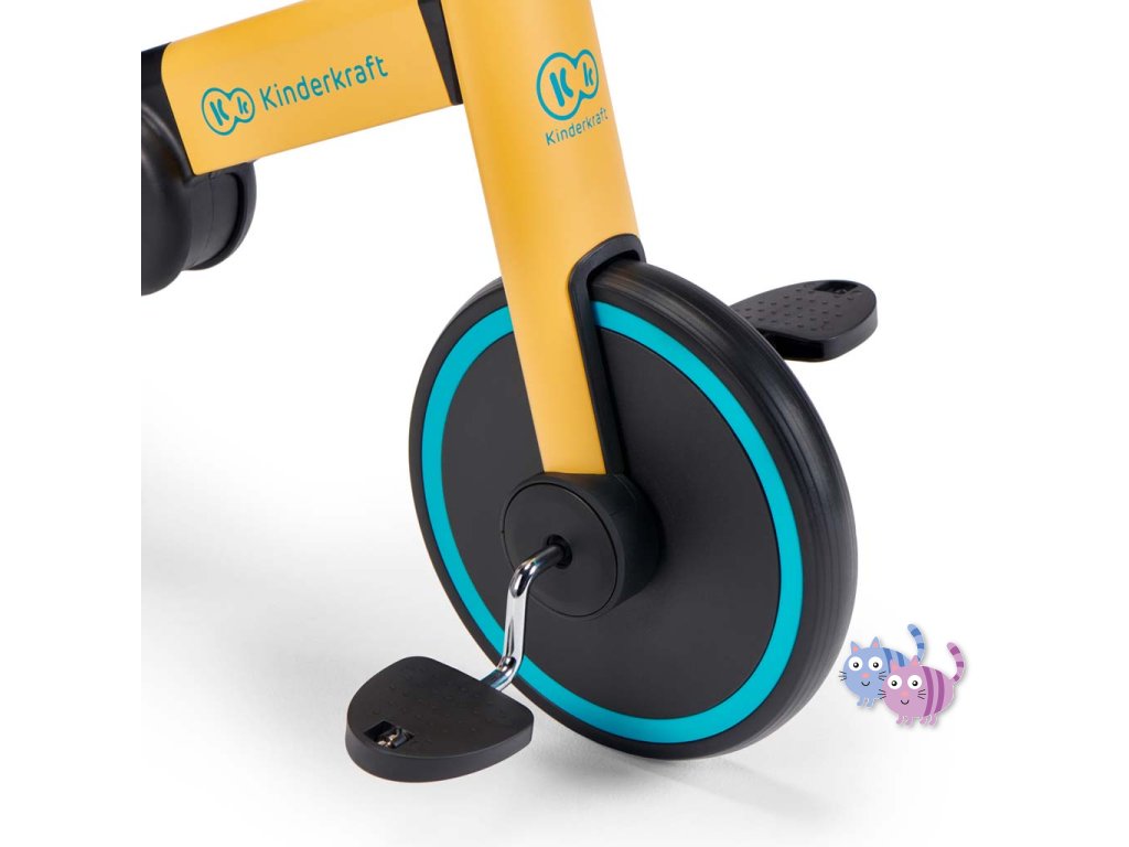 - tříkolka umožňuje jednoduchou a rychlou změnu funkcí. Kolečka stačí otočit a vzájemně spojit, až uslyšíte tiché „kliknutí“, a zablokovat pojistkou! Pro přeměnu odrážedla v tříkolku je nutné vytáhnout pojistku a rozložit nožičky.