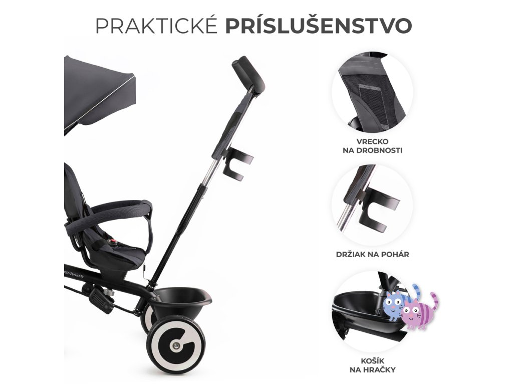 K dětkému kolu jsou pripojeny praktické doplňky: taška na drobnosti, velký košík na drobnosti za sedadlem, držák na pohár pro rodiče a zvonek.