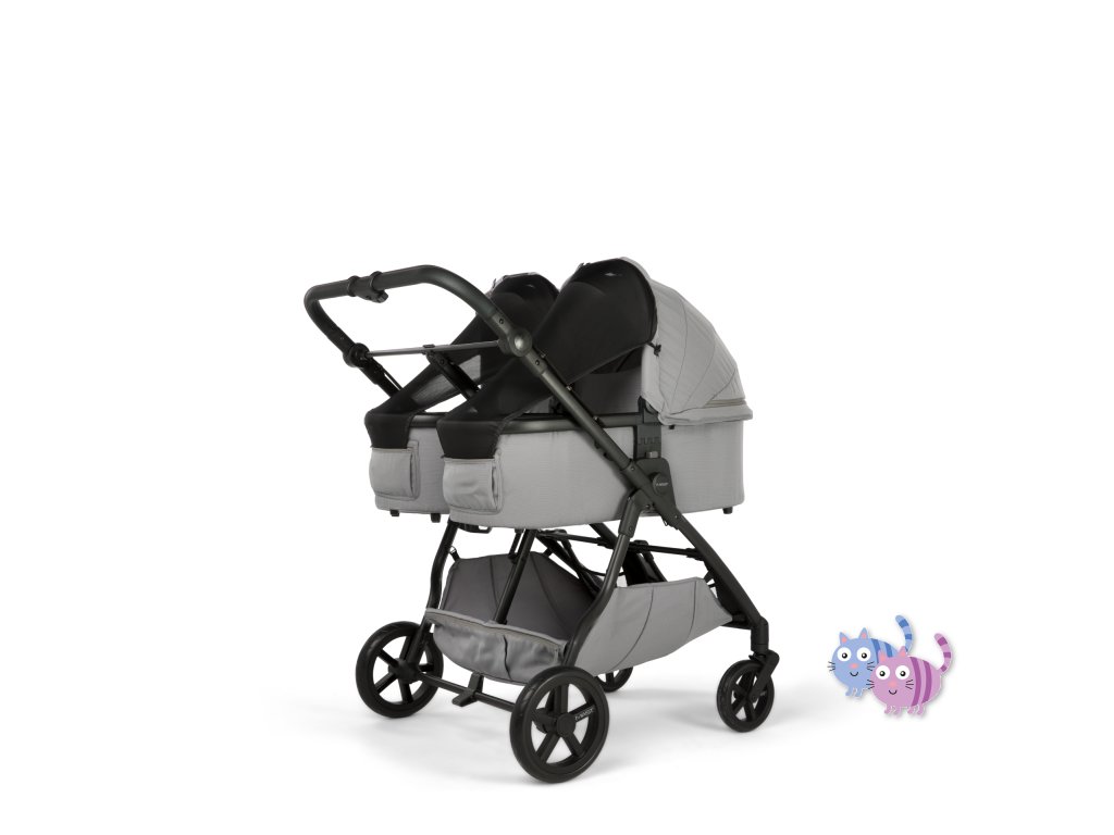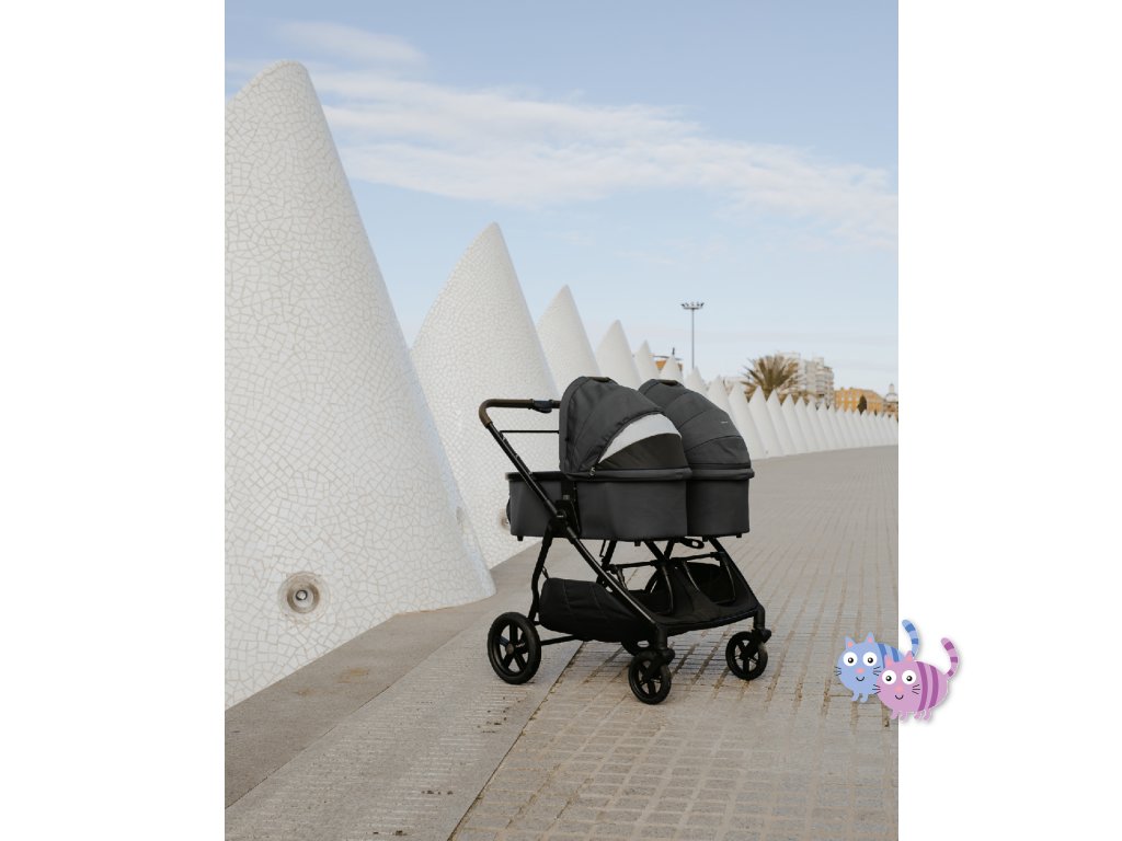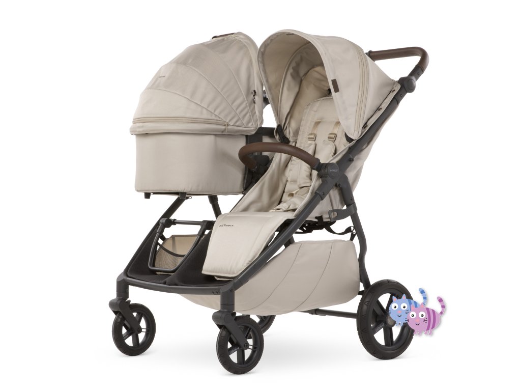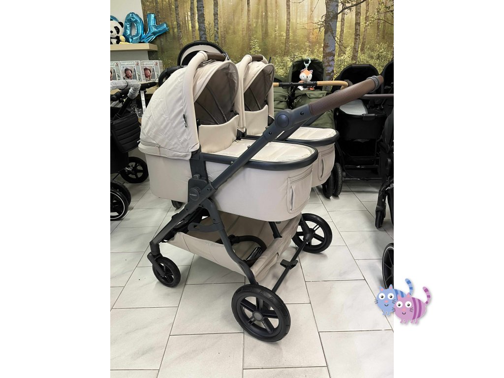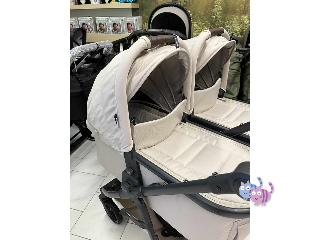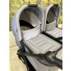 Lehký a skladný podvozek, gelová kola, velice kvalitní potah kočárku, impregnovaný, UV +50. Kožená rukojeť i madla. Nosnost 2x22 kg. Odpružený podvozek.