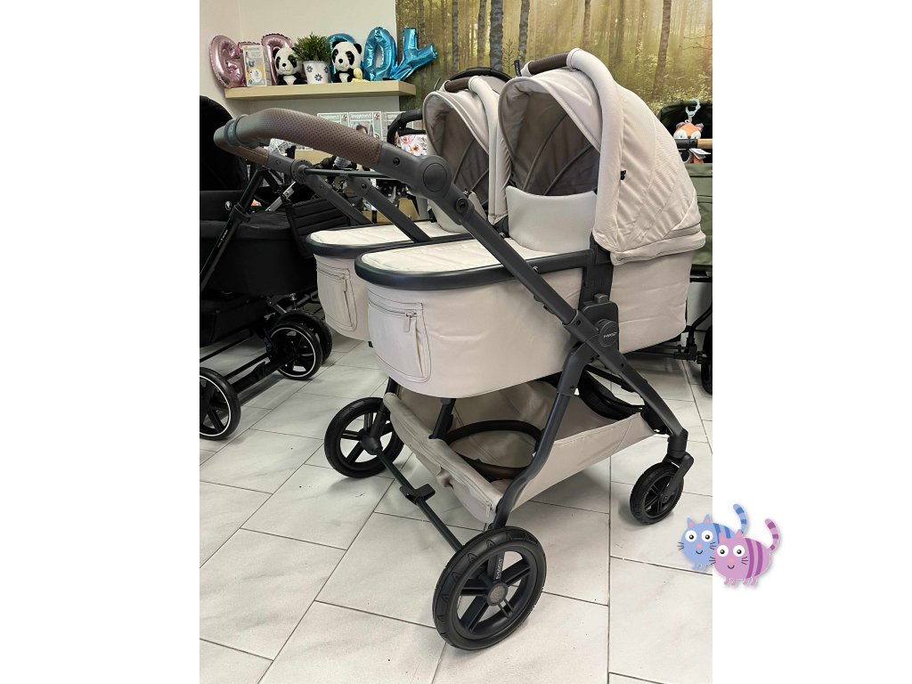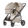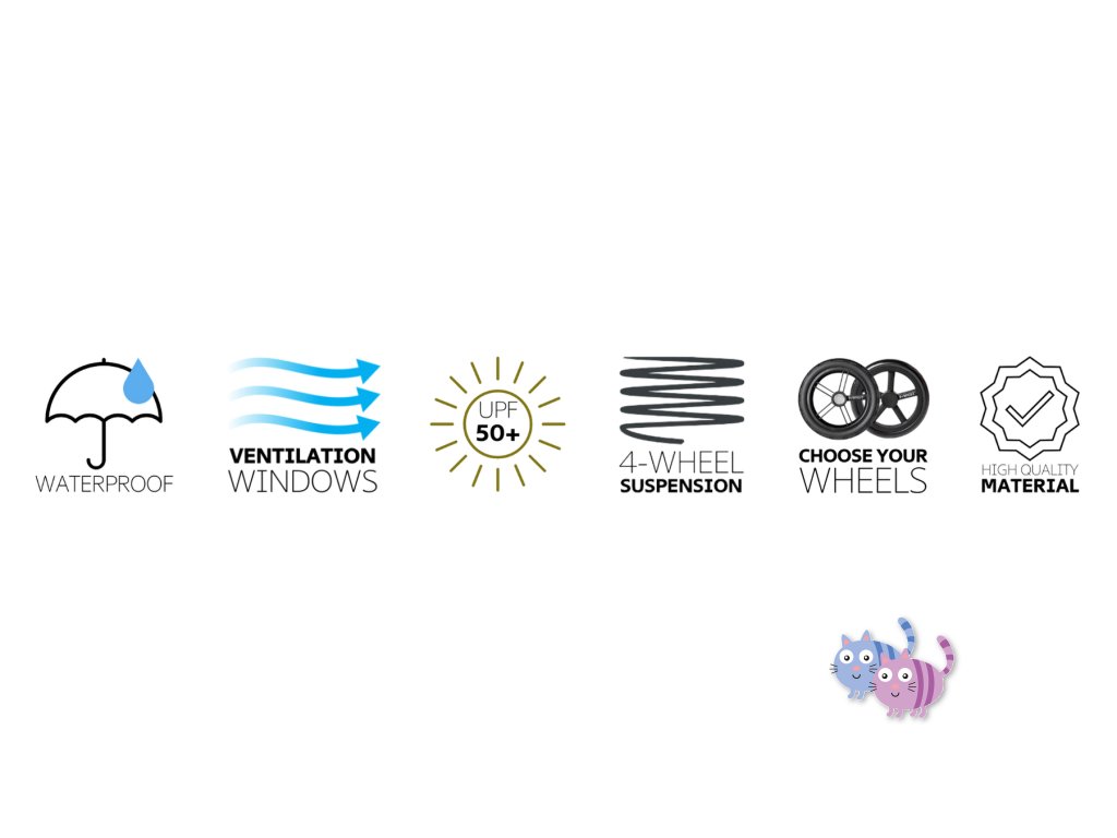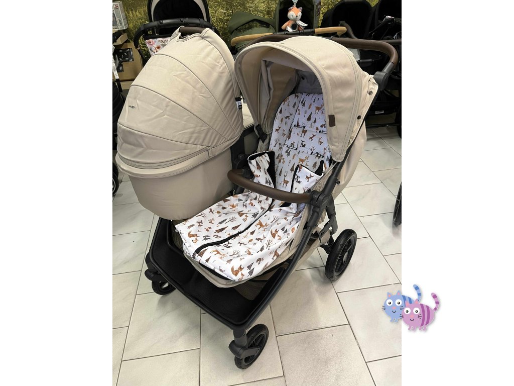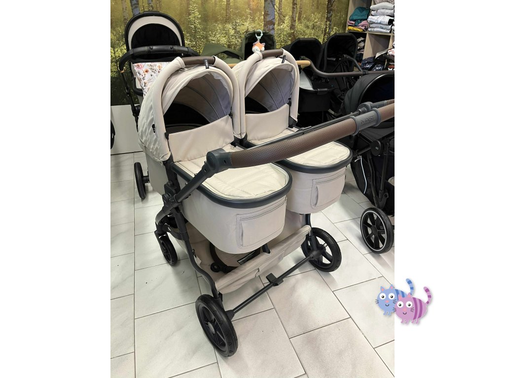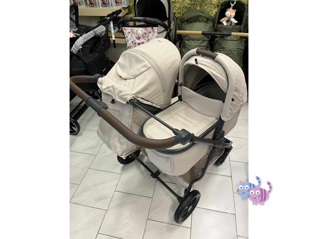 Lehký a skladný podvozek, gelová kola, velice kvalitní potah kočárku, impregnovaný, UV +50. Kožená rukojeť i madla. Nosnost 2x22 kg. Odpružený podvozek.