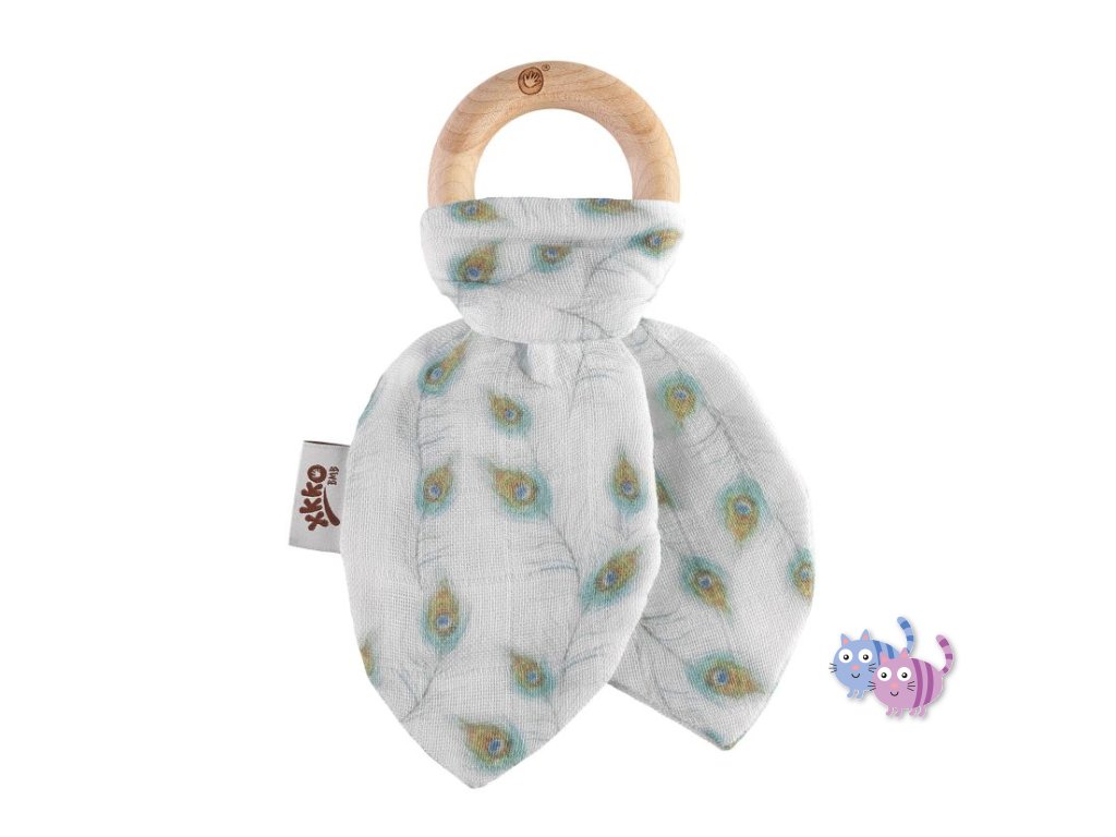 „Dřevěné kousátko XKKO BMB s šustivými lístky z extrémně jemného bambusového mušelínu. Bambusová viskoza je antibakteriální a nezpůsobuje žádnou alergickou reakci. Velký, dokonale hladký kroužek je ručně vyrobený z javorového dřeva. Kroužek není barvený ani lakovaný.“ Jako alternativu k těmto kusátkům Vám ještě můžeme nabídnout kousátka s odnímatelnou plenkou nebo čistě dřevěné kousací kroužky z javorového dřeva.