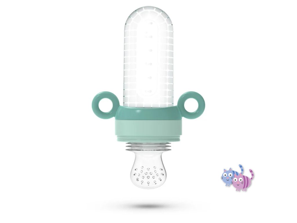 - Podlouhlá odměrka, do které se vkládá jídlo, je vyrobena z pružného silikonu. To umožňuje dítěti vytlačit nebo rozdrtit jídlo samo tím, že jej mísí prsty.
