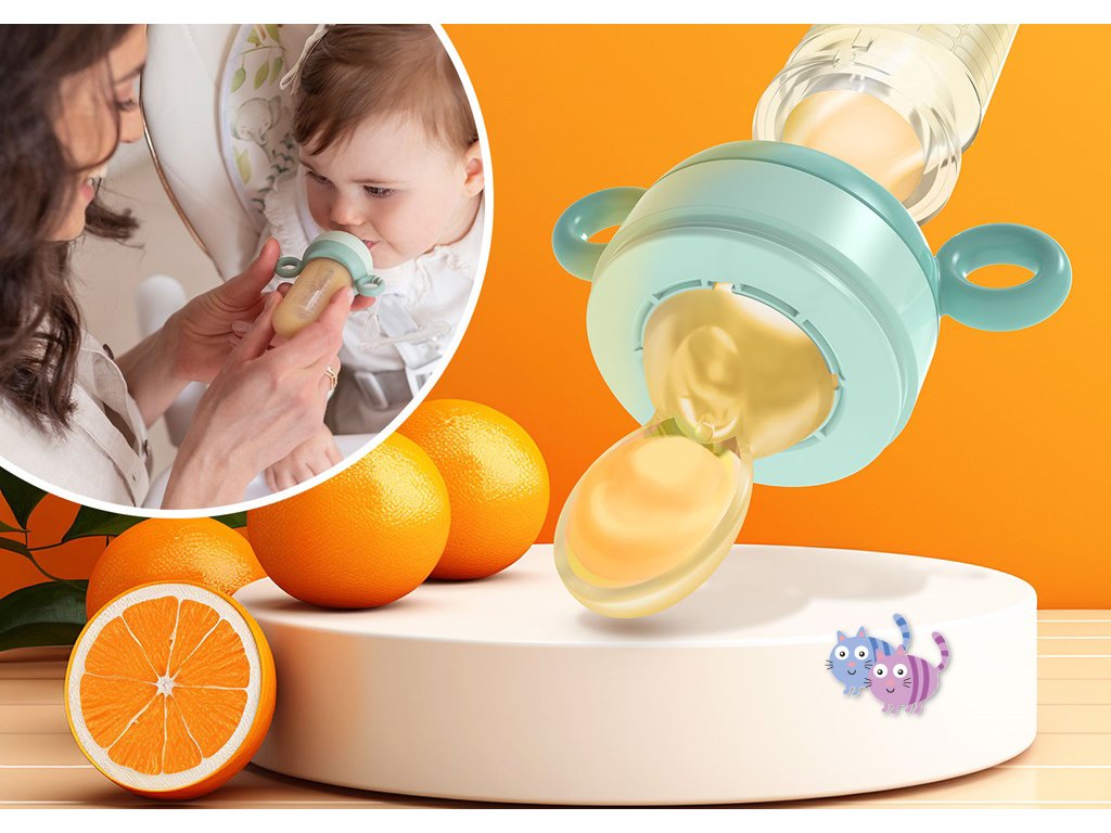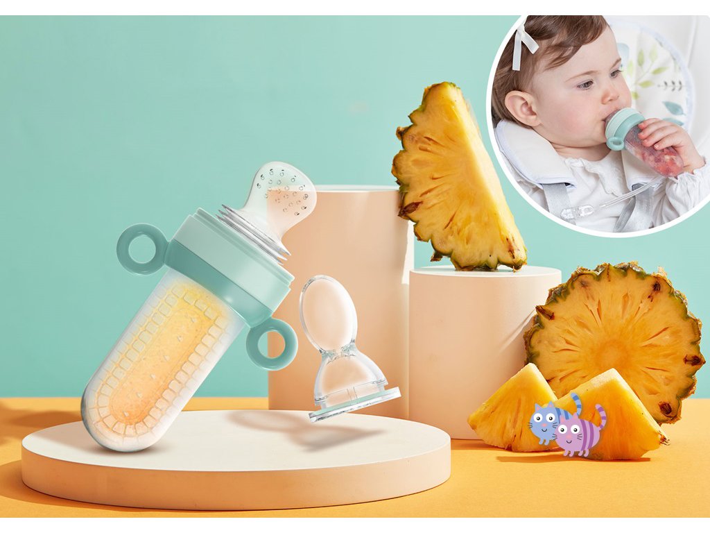 - Ovocné pěny nebo husté polévky jsou součástí dětského jídelníčku. Nástavec lžičky, který je součástí soupravy, umožňuje dítěti vyzkoušet si je s pomocí rodiče nebo samostatně.