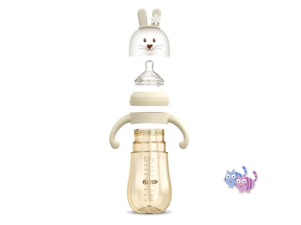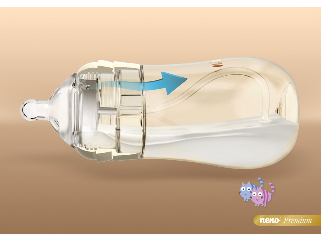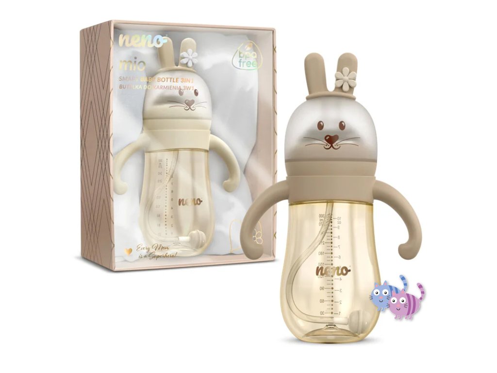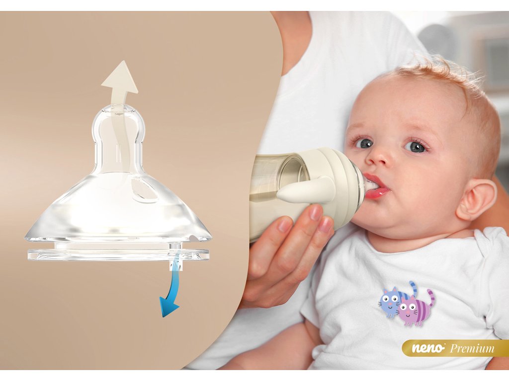 Neno Mio je inteligentní kojenecká láhev 3 v 1 s dudlíkem proti kolice, který ovlivňuje přirozenou polohu jazyka. Je ideální pro každodenní krmení a při rozšiřování jídelníčku vašeho miminka. Je vyrobena z PPSU materiálu, který je odolný vůči mechanickému poškození. Má speciální průtokový systém s otvorem ve tvaru křížku, který lze použít k podávání mléka, vody, čaje, šťávy a jiného tekutého jídla.