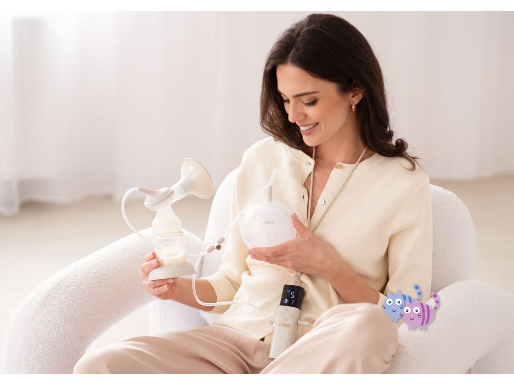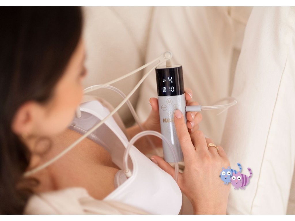 - Dvojitý způsob odsávání – současně odsává mléko z obou prsou, čímž šetří čas a zvyšuje efektivitu