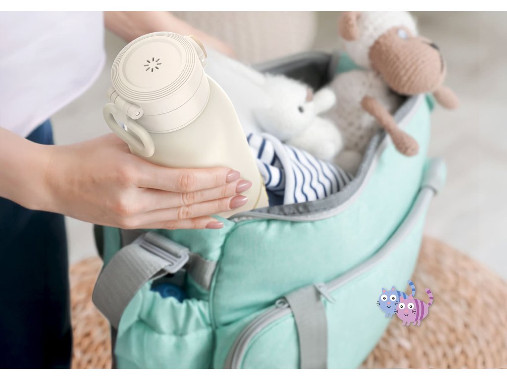 - Kompaktní a lehký design: Ohřívač je dostatečně malý, aby se vešel do vaší tašky. Je ideální pro procházky s dítětem či výlety nebo každodenní nákupy.