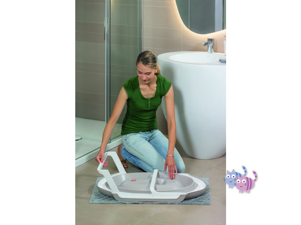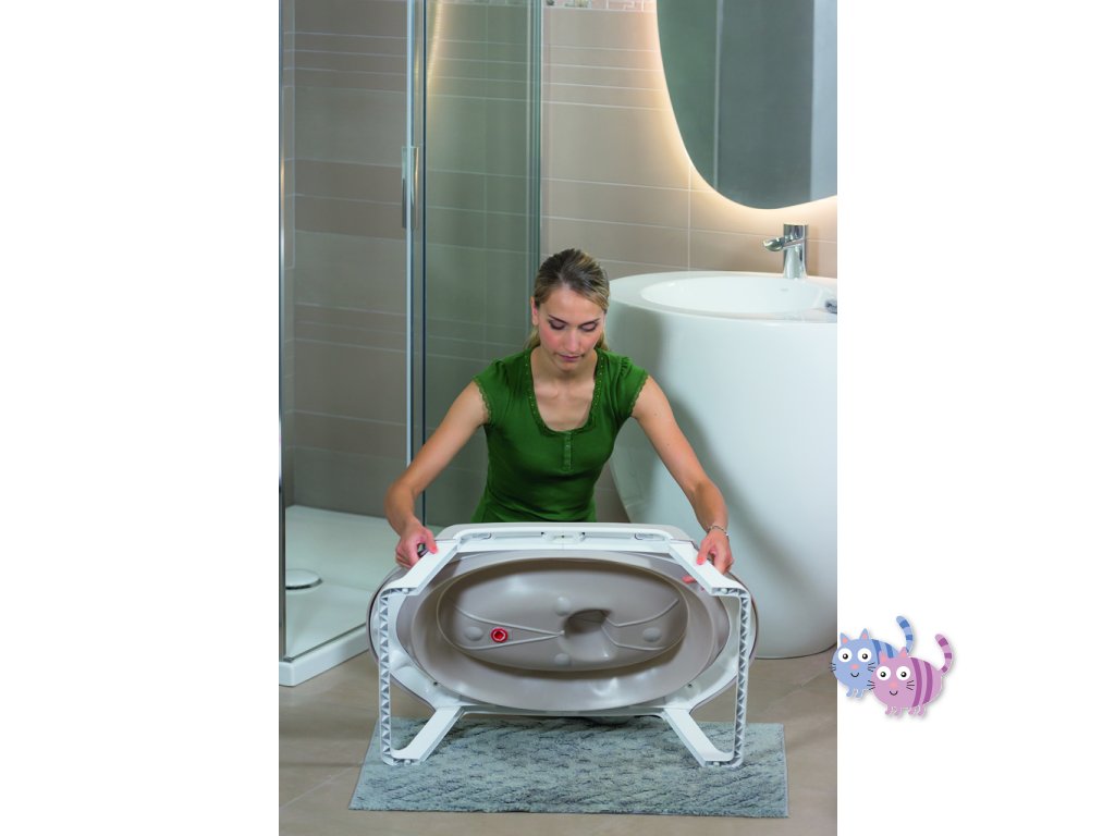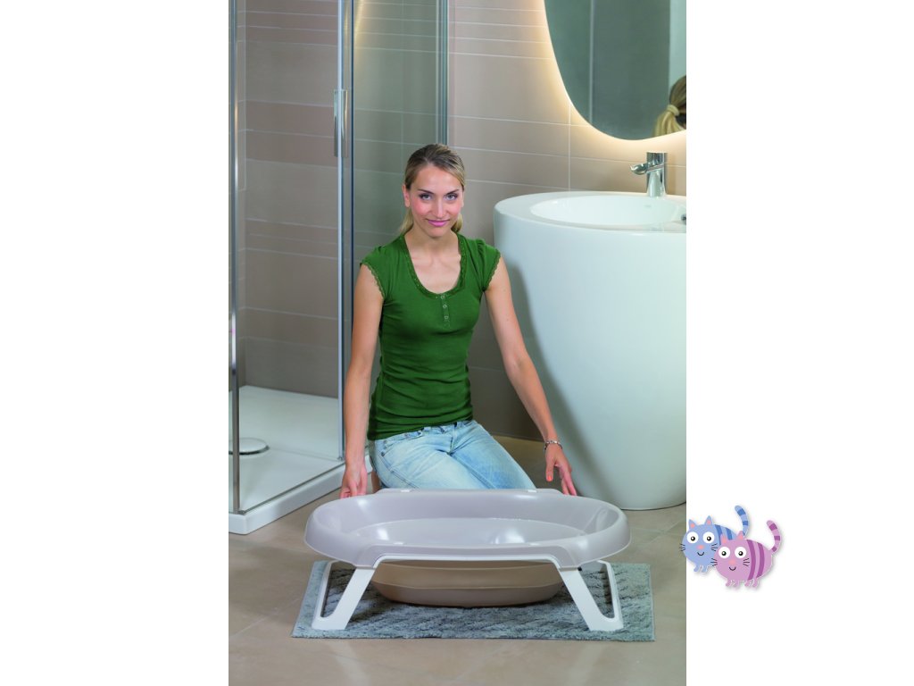 - Vanička je vybavena záchytným bodem mezi nohama dítěte, který zabraňuje jeho sklouznutí. I díky této funkci může být vana použita ve dvou sedacích pozicích, které dítěti umožňují udržovat dobrou polohu při dospívání (0/6 měsíců a 6/12 měsíců) a mohou se pohybovat nohama a rukama.