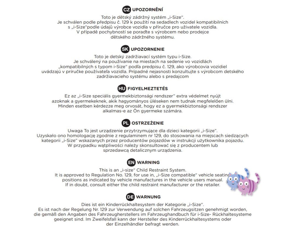 Toto je dětský zádržný systém „i-Size“. Je schválen podle předpisu č. 129 k použití na sedadlech vozidel kompatibilních s „i-Size“ podle údajů výrobce vozidla v příručce pro uživatele vozidla. V případě pochybností se poraďte s výrobcem nebo prodejcem dětského zádržného systému.
