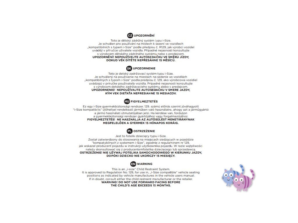 Toto je dětský zádržný systém typu i-Size. Je schválen pro používání na místech k sezení ve vozidlech kompatibilních s typem i-Size, 129, jak výrobci vozidel uvádějí v příručce uživatele vozidla. Případně nejasnosti konzultujte s výrobcem dětského zádržného systému nebo s prodejcem.