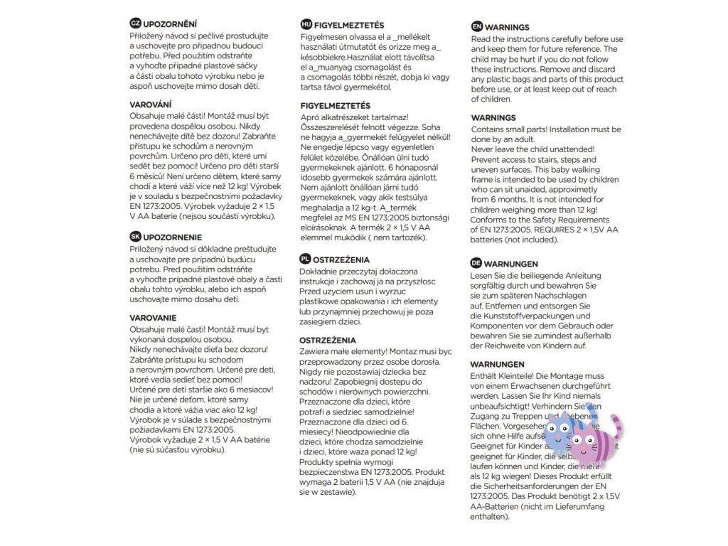 Obsahuje malé části! Montáž musí být provedena dospělou osobou. Nikdy nenechávejte dítě bez dozoru! Zabraňte přístupu ke schodům a nerovným povrchům. Určeno pro děti, které umí sedět bez pomoci! Určeno pro děti starší 6 měsíců! Není určeno dětem, které samy chodí a které váží více než 12 kg! Výrobek je v souladu s bezpečnostními normami EN 1273:2005