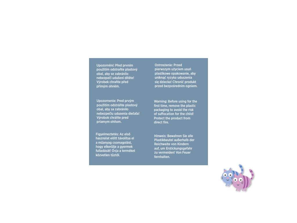 UPOZORNĚNÍ Před prvním použitím odstraňte plastový obal, aby se zabránilo nebezpečí udušení dítěte! Výrobek chraňte před přímým ohněm.