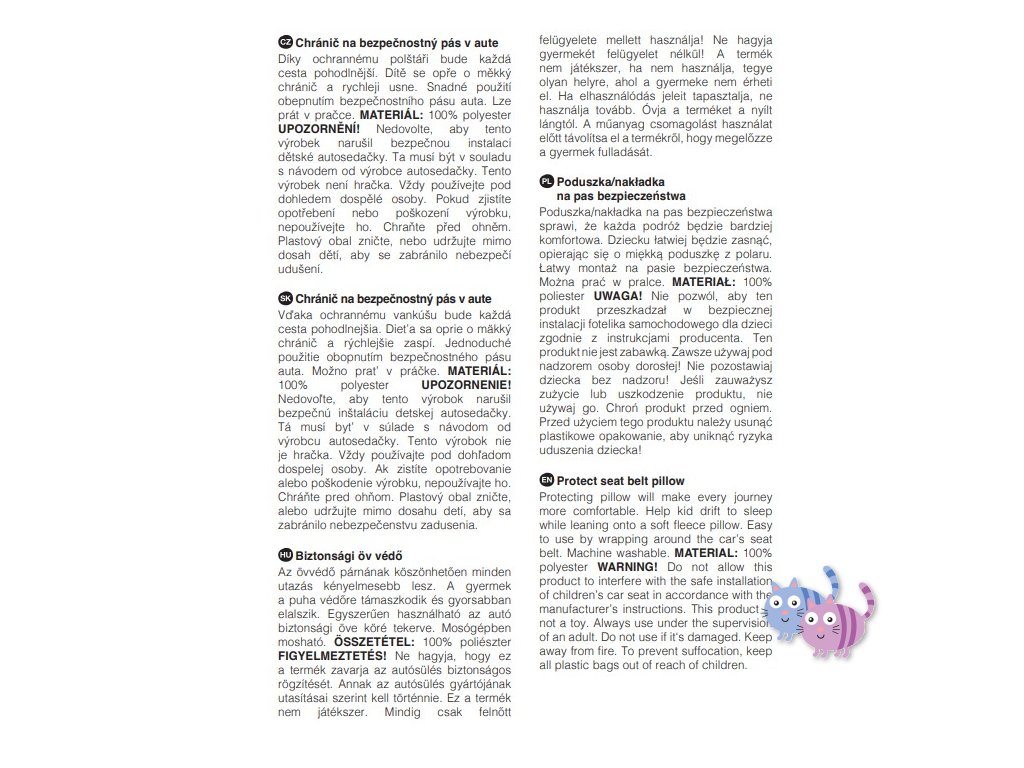 Tato praktická pomůcka na bezpečnostní pás ochrání Vaše děťátko před oděrkami, zabrání aby děťátko bezpečnostní pás tlačil a tím zajistí komfortnější cestování. Chránič je vyroben z příjemného, měkkého plyše. Lze jej prát v pračce.
