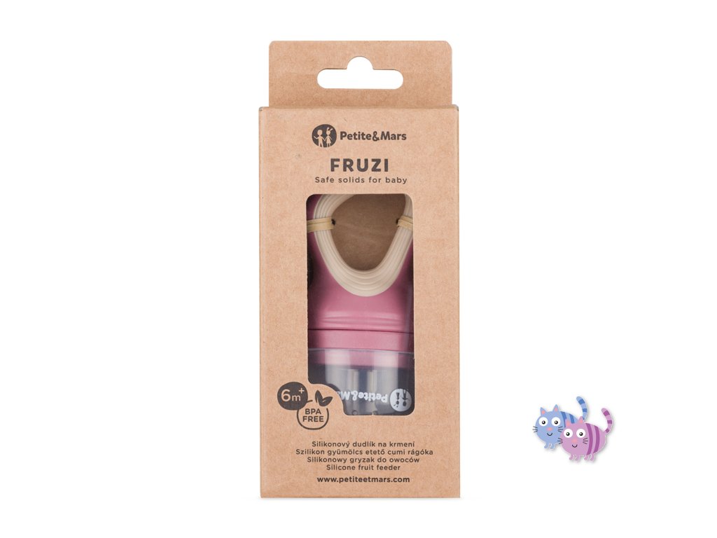 Fruzi je ideální dudlík na krmení, který vašemu dítěti umožní bezpečně ochutnávat tuhé potraviny a zároveň uleví od bolesti dásní při prořezávání zoubků. Perfektní pro děti od 6 měsíců. Vyroben ze 100 % bezpečného silikonu. Fruzi umožňuje podávat ovoce, zeleninu nebo vařená jídla v nejpřátelštější formě pro dítě. Malé otvory v silikonovém nástavci propouštějí malé porce jídla kontrolovaně, čímž snižují riziko zaskočení a zajišťují bezpečné krmení.