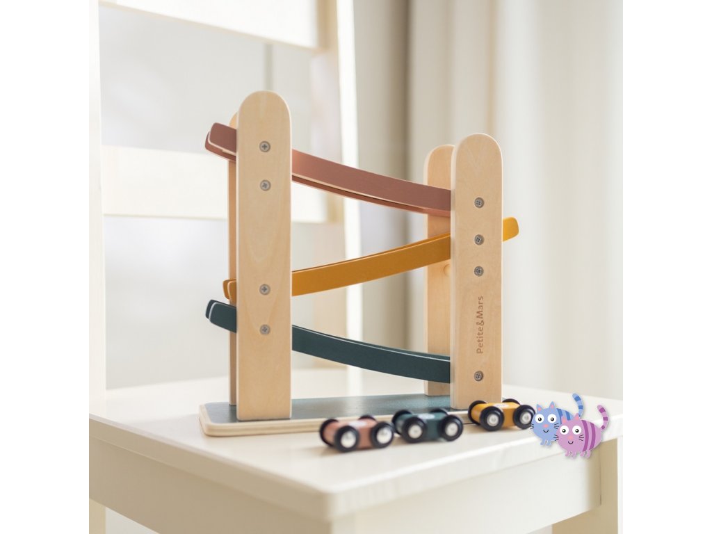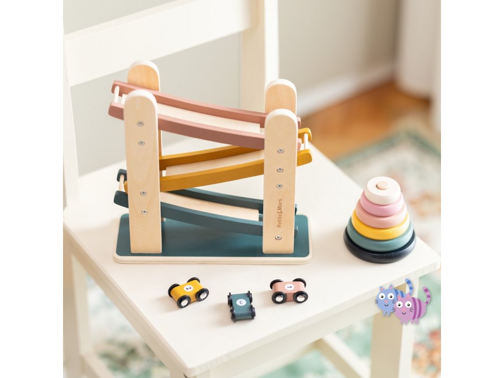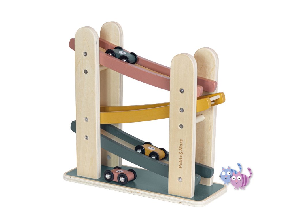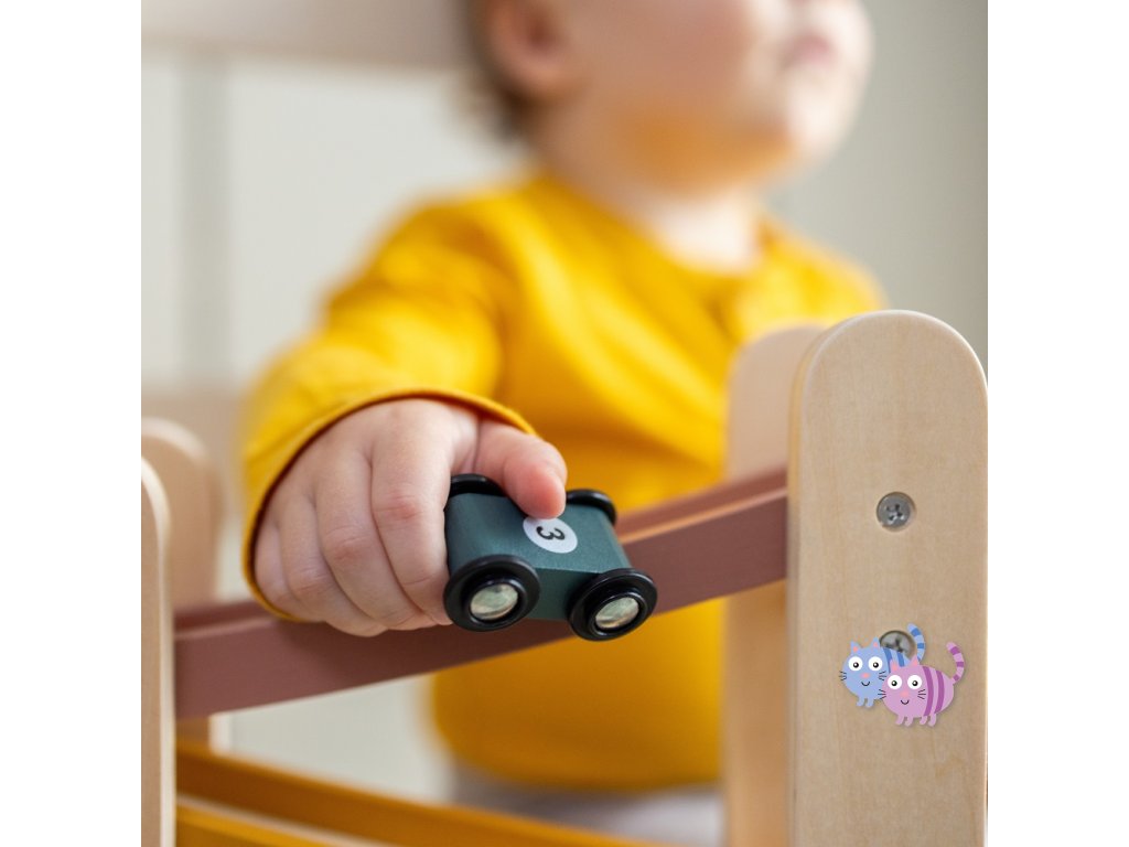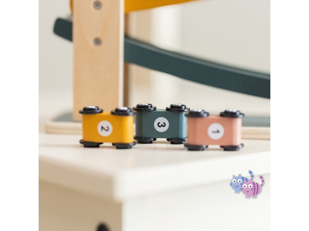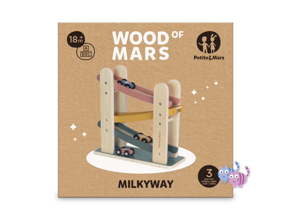 Dřevěná závodní dráha pro autíčka MILKY WAY je víceúrovňovým dobrodružstvím pro malé fanoušky závodu. Souprava se skládá ze 3 úrovní a 3 malých autíček, které lze spustit shora dolů, což poskytuje atraktivní zábavu. Autíčka lze použít i na samostatné závody a minimalistický design dráhy v jemných, tlumených barvách se dokonale hodí do dětského pokoje.