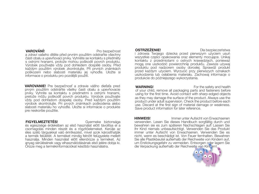 Pro bezpečnost a zdraví vašeho dítěte před prvním použitím odstraňte všechny části obalu a upevňovací prvky. Vyhněte se kontaktu s předměty s ostrými hranami, protože mohou poškodit povrch produktu. Výrobek používejte vždy pod dohledem dospělé osoby. Před každým použitím výrobek zkontrolujte. Při prvních známkách poškození nebo slabosti materiálu produkt zlikvidujte. Uložte si informace o produktu pro pozdější použití.