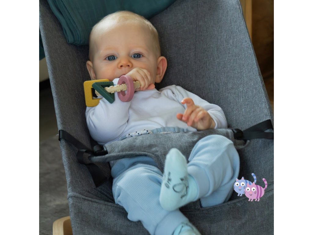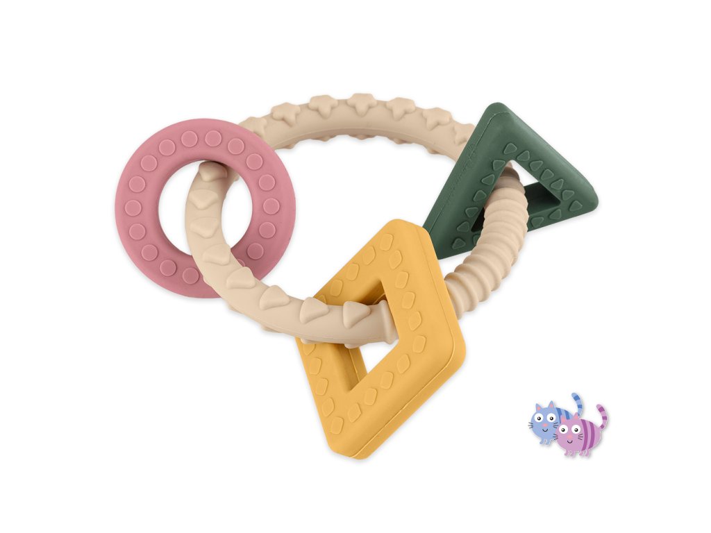 Silikonové kousátko FIGURES, které se skládá z kroužku s výstupky, na nichž jsou geometrické tvary, umožňuje dítěti objevovat svět nových pocitů. Je nejen zdrojem zábavy, ale také nástrojem, který stimuluje vývoj. Různé tvary a textury nabízejí vašemu dítěti zajímavé hmatové vjemy, pomáhají zkoumat hmat a korigují rozvíjející se smyslové dovednosti.