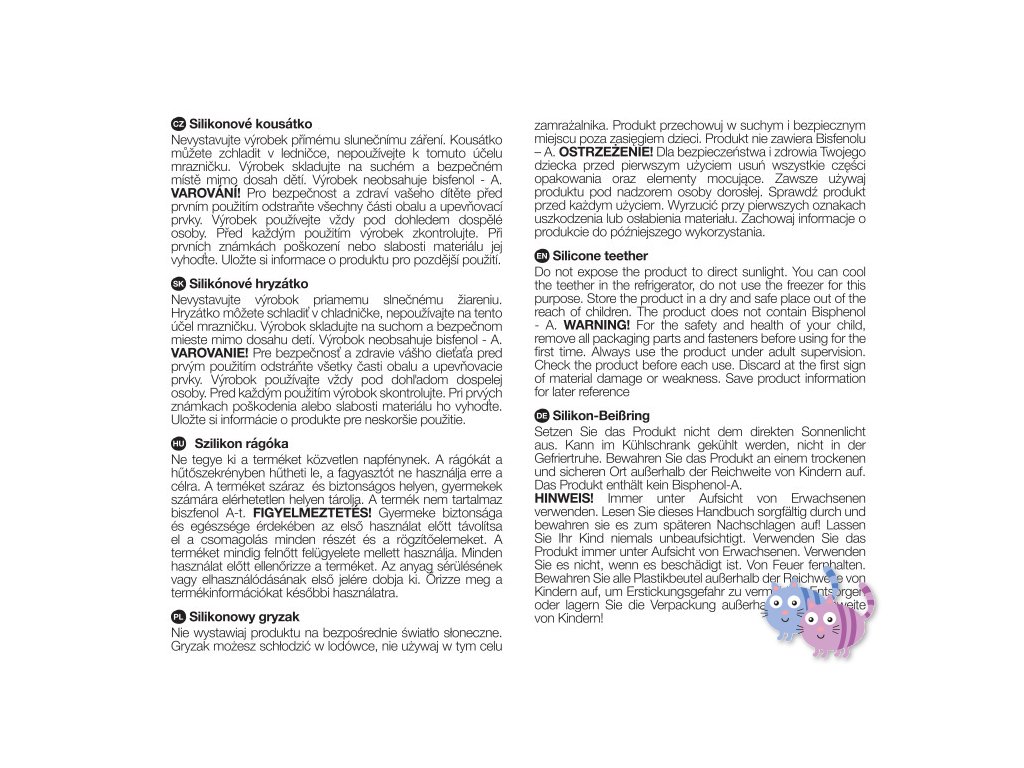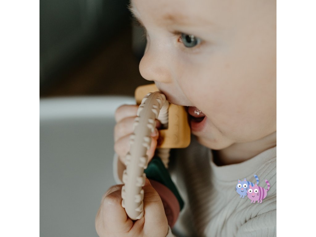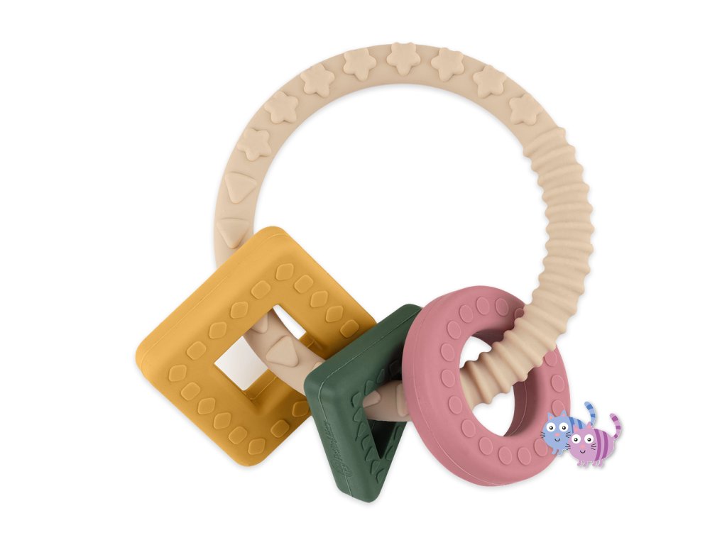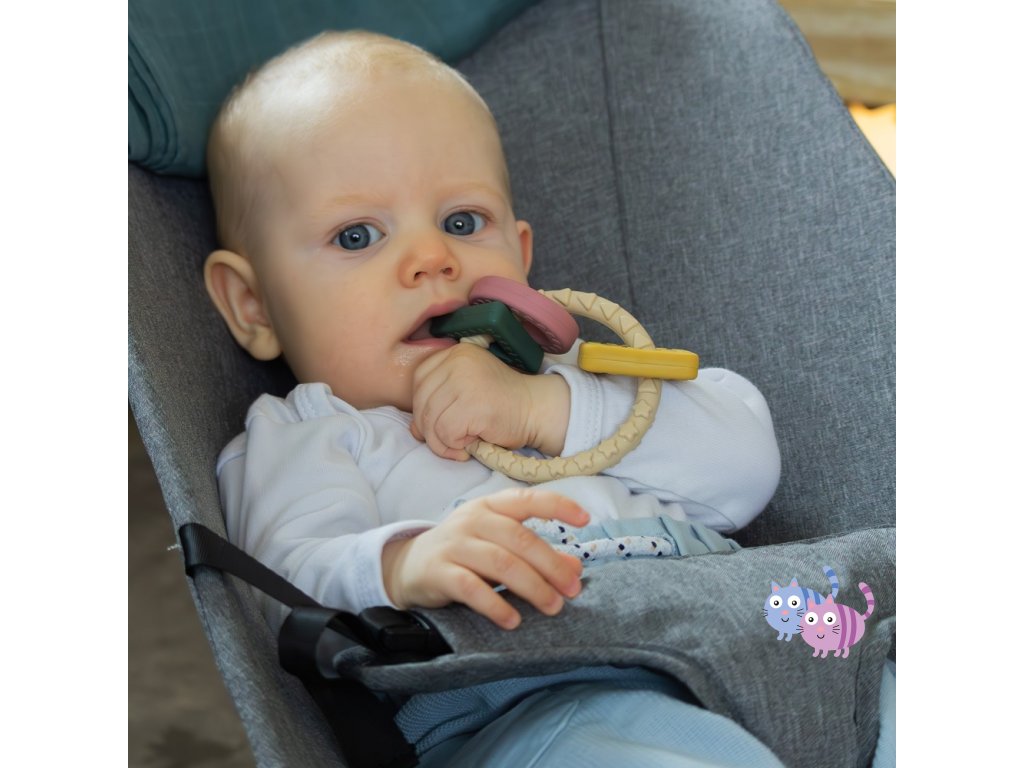 Měkké silikonové kousátko sestávající z kroužku se 3 zajímavými prvky je vyrobeno výhradně z potravinářského silikonu bez obsahu BPA. Nejkvalitnější odolné materiály zaručují bezpečnost vašeho děťátka během hry a prořezávání zoubků. Pružný silikon je dokonale vhodný pro citlivé dětské dásně. Pomáhá zmírnit bolest, která vzniká při prořezávání zoubků, neboť při kousání kousátka se jemně masírují dásně. Kousátko lze zchladit v chladničce a dát děťátku studené. Různé povrchy kousátka stimulují správný vývoj čelisti.