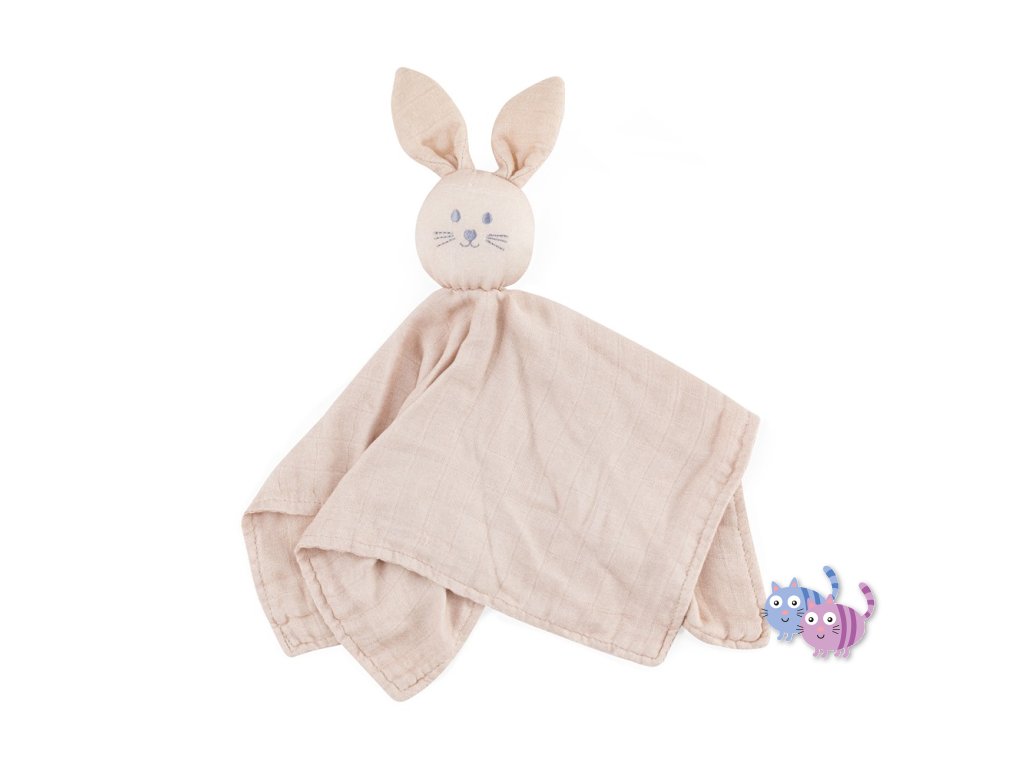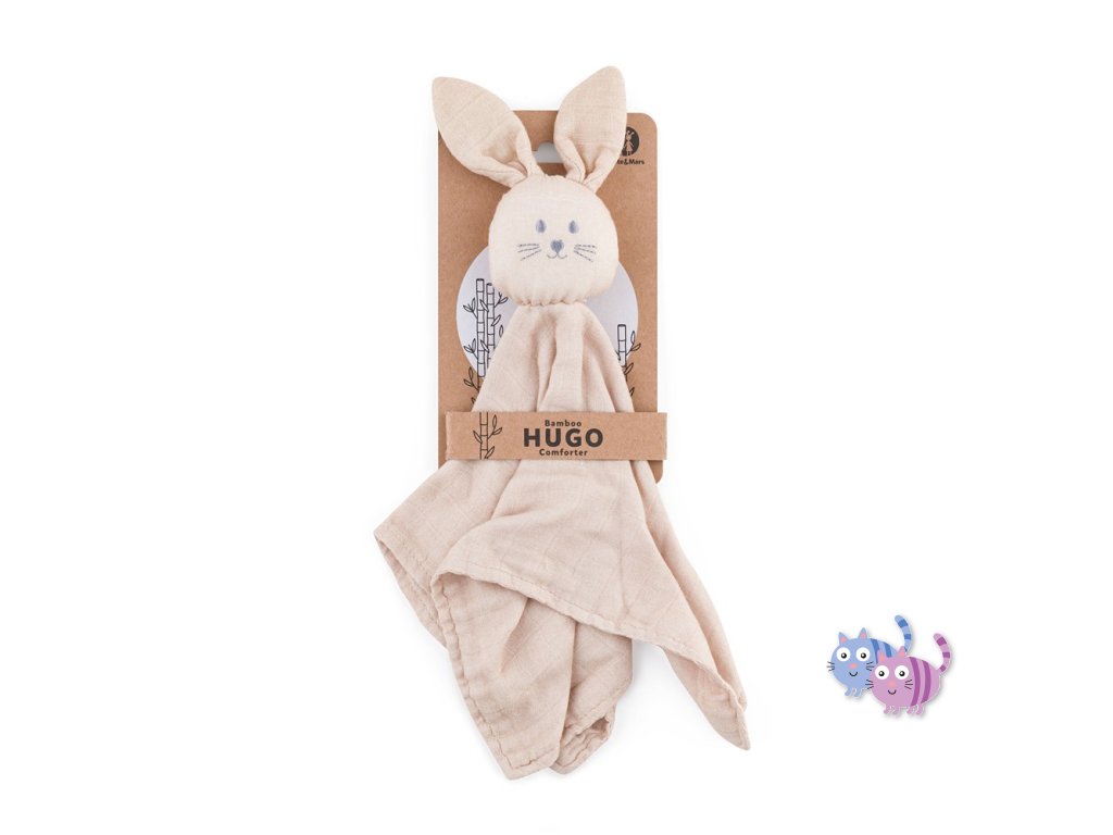 Měkoučký mušelinový zajíček Hugo má jednu tajnou zálibu. Nejraději ze všeho se vyvaluje v posteli a spí. Je to skvělý kamarád a hračka na spaní pro nejmenší dětičky. Hugo se rád tulí, přináší pocit tepla a něhy. S ním nikdo není sám. Je velmi příjemný a hebký na dotek, dokáže děťátko uklidnit po náročném dni.