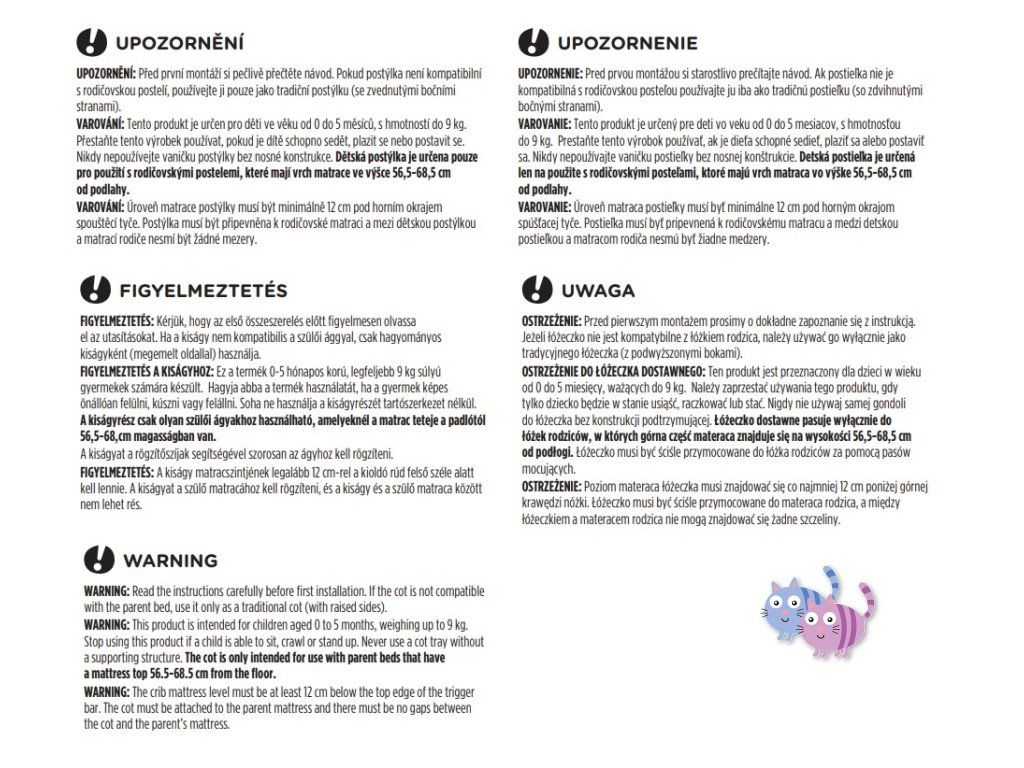 UPOZORNĚNÍ! Tento produkt je určen pro děti ve věku od 0 do 5 měsíců, s hmotností do 9 kg. Přestaňte tento výrobek používat, pokud je dítě schopno sedět, plazit se nebo postavit se. Nikdy nepoužívejte vaničku postýlky bez nosné konstrukce. Dětská postýlka je určena pouze pro použití s rodičovskými postelemi, které mají vrch matrace ve výšce 56,5-68,5 cm od podlahy.