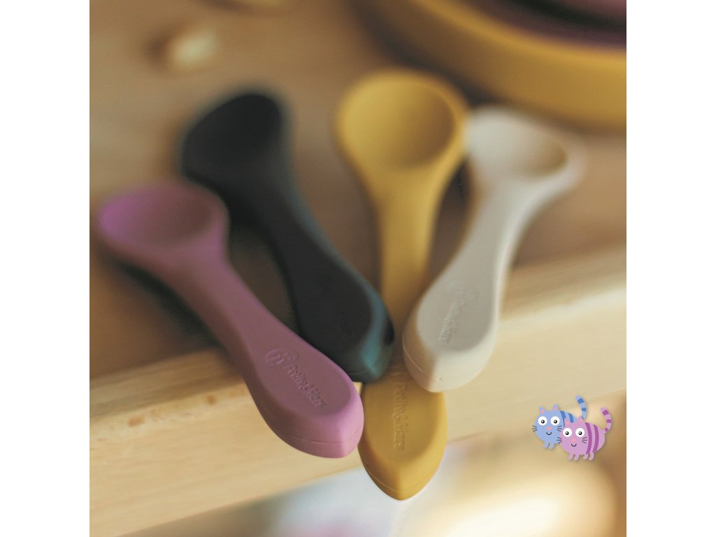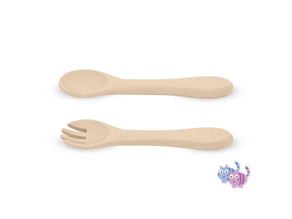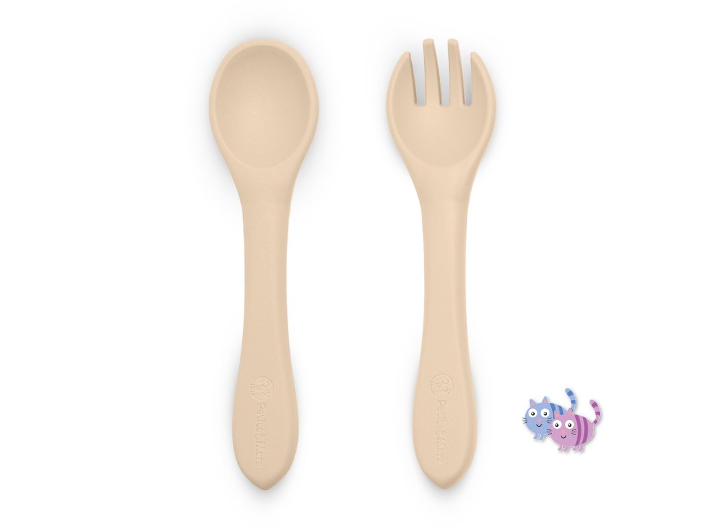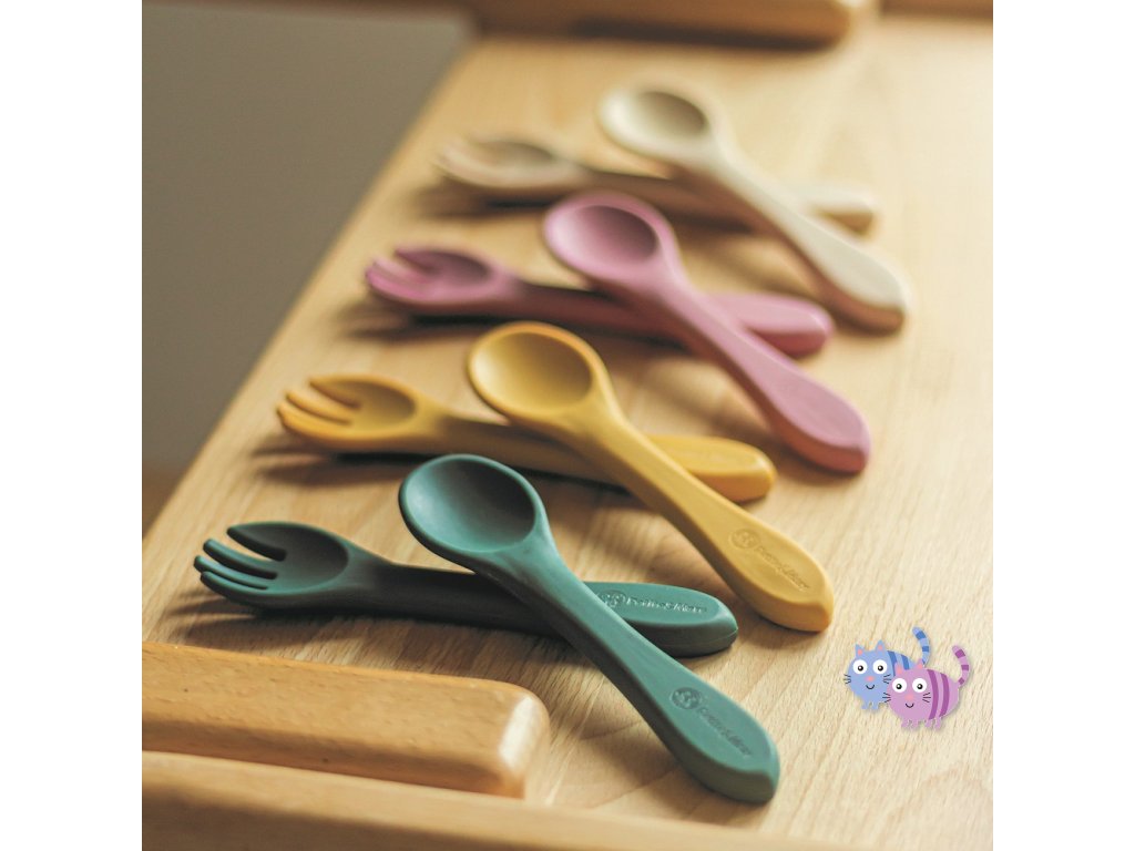 Souprava sestávající z vidličky a lžičky je celá vyrobena z potravinářského silikonu bez obsahu BPA. Díky tomu může vaše dítě jíst příborem teplá i studená jídla. Díky pružnému silikonu je příbor ideální pro citlivé dásně malého dítěte. Příbor je vhodný pro děti od 6 měsíců, které se seznamují s pestrou stravou, a pro ty, které se již úspěšně učí jíst samy. Zaoblené tvary a malé rozměry usnadňují děťátku jejich uchopení a tím i papání.