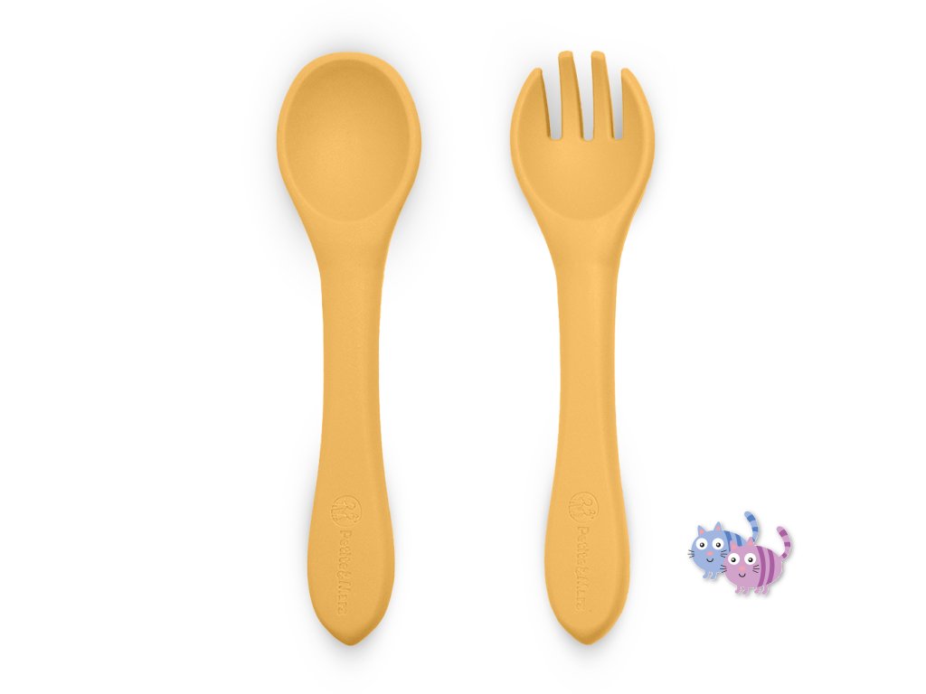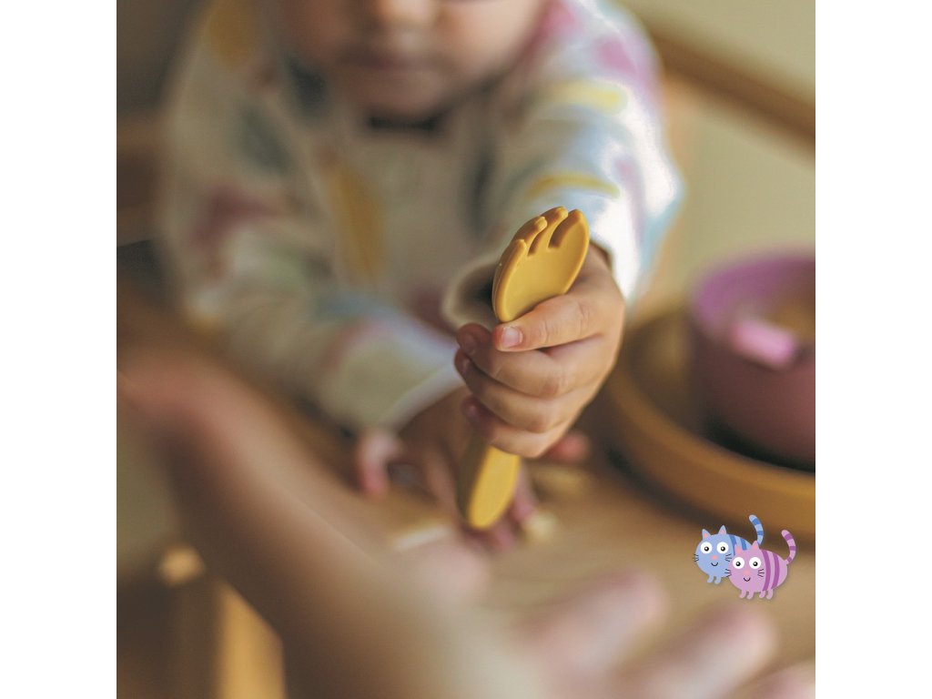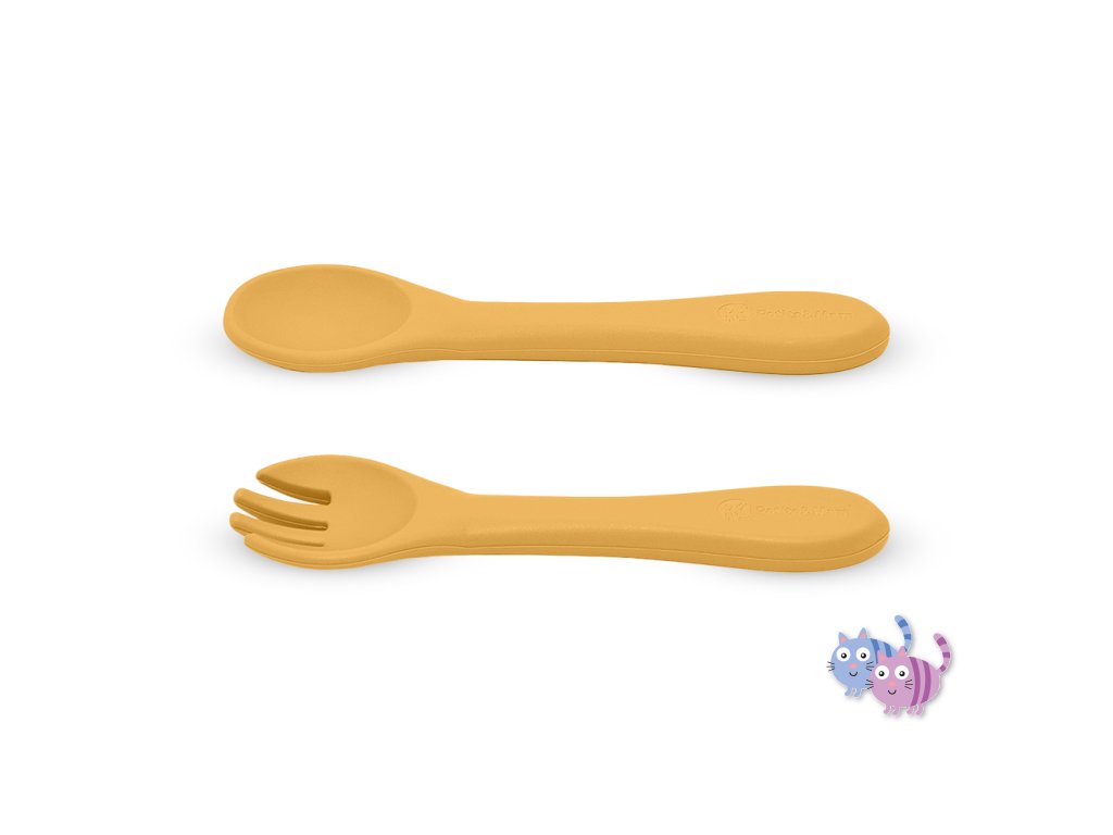 Souprava sestávající z vidličky a lžičky je celá vyrobena z potravinářského silikonu bez obsahu BPA. Díky tomu může vaše dítě jíst příborem teplá i studená jídla. Díky pružnému silikonu je příbor ideální pro citlivé dásně malého dítěte. Příbor je vhodný pro děti od 6 měsíců, které se seznamují s pestrou stravou, a pro ty, které se již úspěšně učí jíst samy. Zaoblené tvary a malé rozměry usnadňují děťátku jejich uchopení a tím i papání.