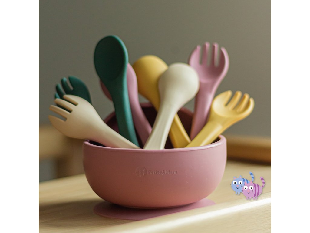 Souprava sestávající z vidličky a lžičky je celá vyrobena z potravinářského silikonu bez obsahu BPA. Díky tomu může vaše dítě jíst příborem teplá i studená jídla. Díky pružnému silikonu je příbor ideální pro citlivé dásně malého dítěte. Příbor je vhodný pro děti od 6 měsíců, které se seznamují s pestrou stravou, a pro ty, které se již úspěšně učí jíst samy. Zaoblené tvary a malé rozměry usnadňují děťátku jejich uchopení a tím i papání.