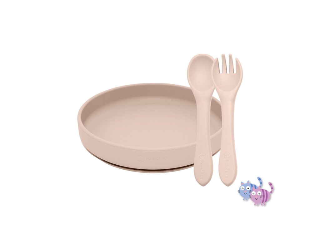 PETITE&MARS Set jídelní silikonový TAKE&MATCH 2 ks talíř + příbor Deset Sand 6m+