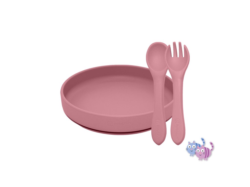 PETITE&MARS Set jídelní silikonový TAKE&MATCH 2 ks talíř + příbor Dusty Rose 6m+