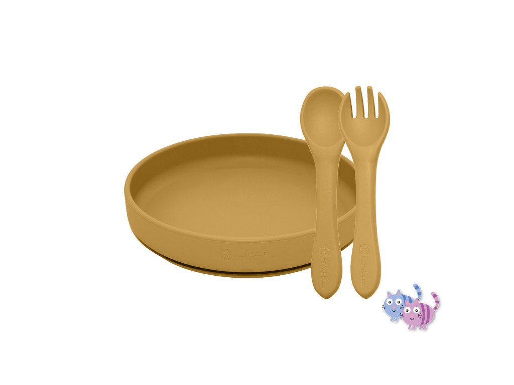 PETITE&MARS Set jídelní silikonový TAKE&MATCH 2 ks talíř + příbor Intense Ochre 6m+