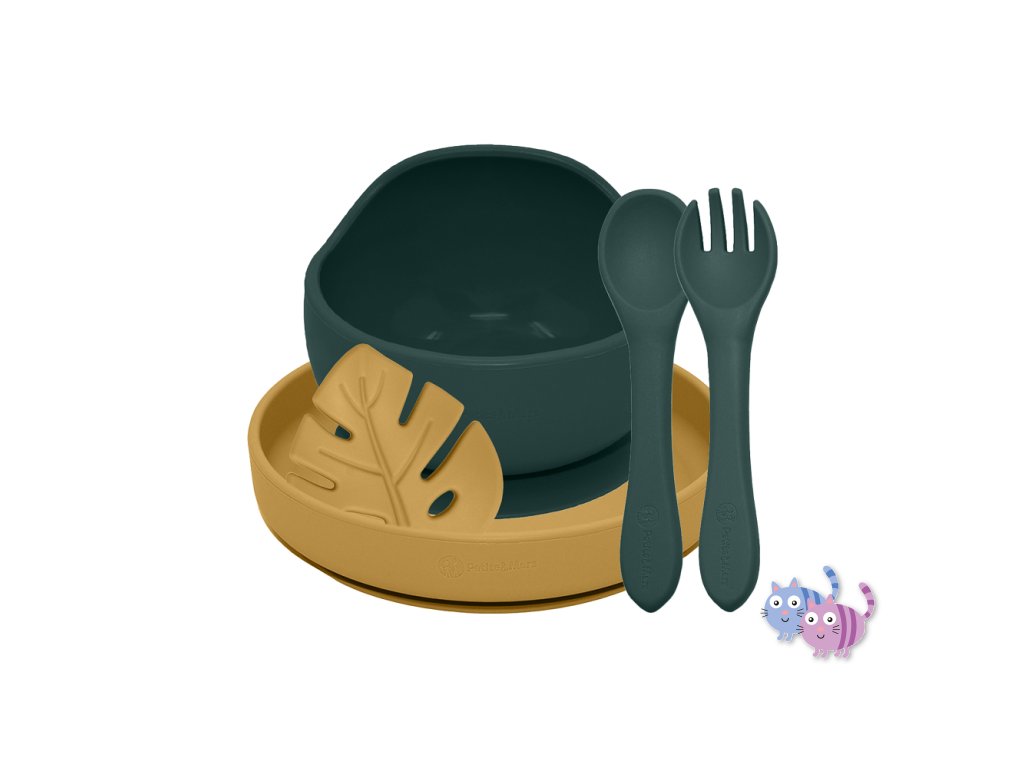 PETITE&MARS Set jídelní silikonový TAKE&MATCH 4 ks Misty Green - Intense Ochre 6m+
