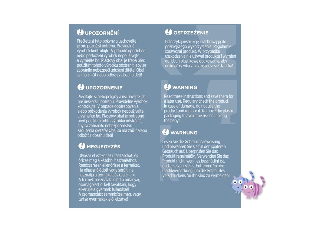 UPOZORNĚNÍ! Pravidelně výrobek kontrolujte. V případě opotřebování nebo poškození výrobek nepoužívejte a vyměňte jej. Plastový obal je třeba před použitím tohoto výrobku odstranit, aby se zabránilo nebezpečí udušení dítěte! Obal se má zničit nebo odložit z dosahu dětí!