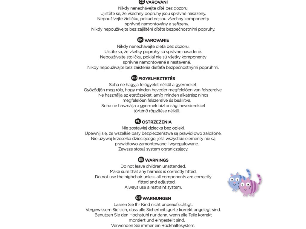 UPOZORNĚNÍ! Nikdy nenechávejte dítě bez dozoru. Ujistěte se, že všechny popruhy jsou správně nasazeny. Nepoužívejte židli, pokud nejsou všechny komponenty správně namontovány a seřízeny. Nikdy nepoužívejte bez zajištění dítěte s bezpečnostními popruhy.