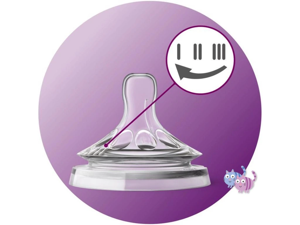 Průtok dudlíku se reguluje natočením láhve v ústech dítěte - pootočením značky I, II, III do polohy oproti nosu miminka ukazuje jaký průtok jste zvolili: