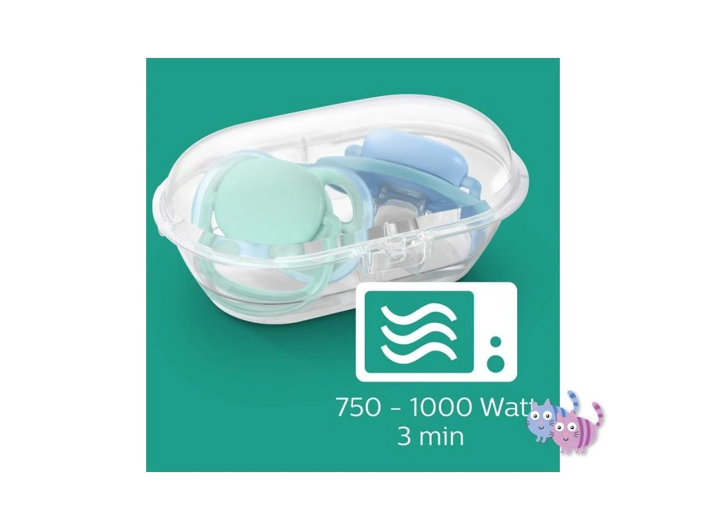 - Sterilizační/transportní krabička umožňuje sterilizovat šidítko v mikrovlnné troubě a nosit s sebou.