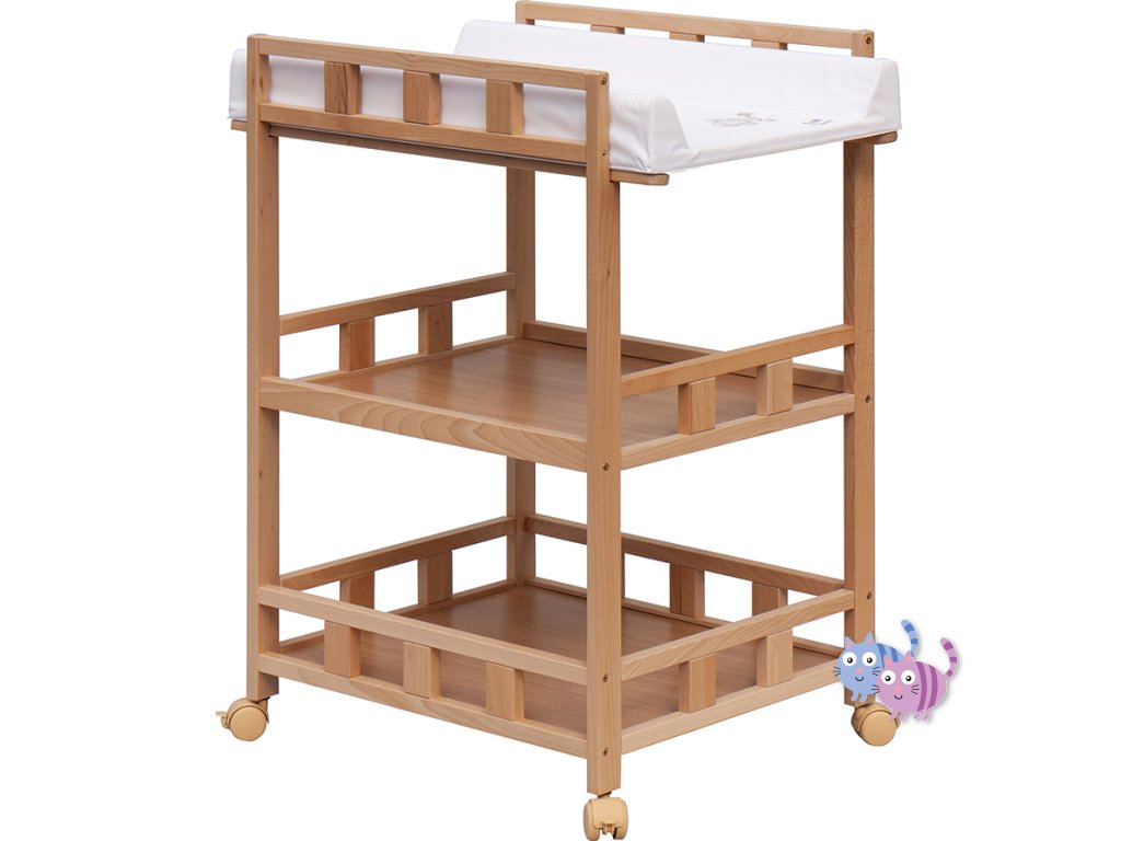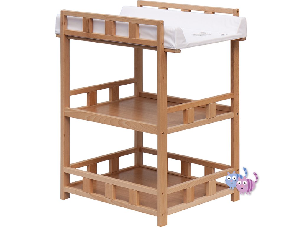 Praktický přebalovací pult se dvěmi policemi z HDF desky. Vrchní přebalovací pult z polyuretanu potažený omyvatelným PVC, vyztužený MDF deskou.