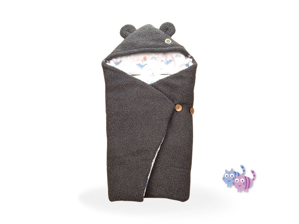 "Zimní zavinovací fusak je určen pro použití v autosedačce nebo samostatně. Unikátní systém otvorů a spon umožní použití fusak v autosedačce, aniž byste museli složitě rozepnout pásy. Po zapnutí dítěte do autosedačky je možné dítě zavinout. Velkou výhodou je, že fusak nepadá z autosedačky, tak jako běžná deka, a dokonale zakryje celé dítě."