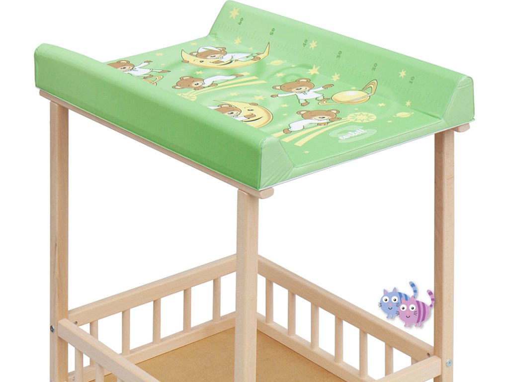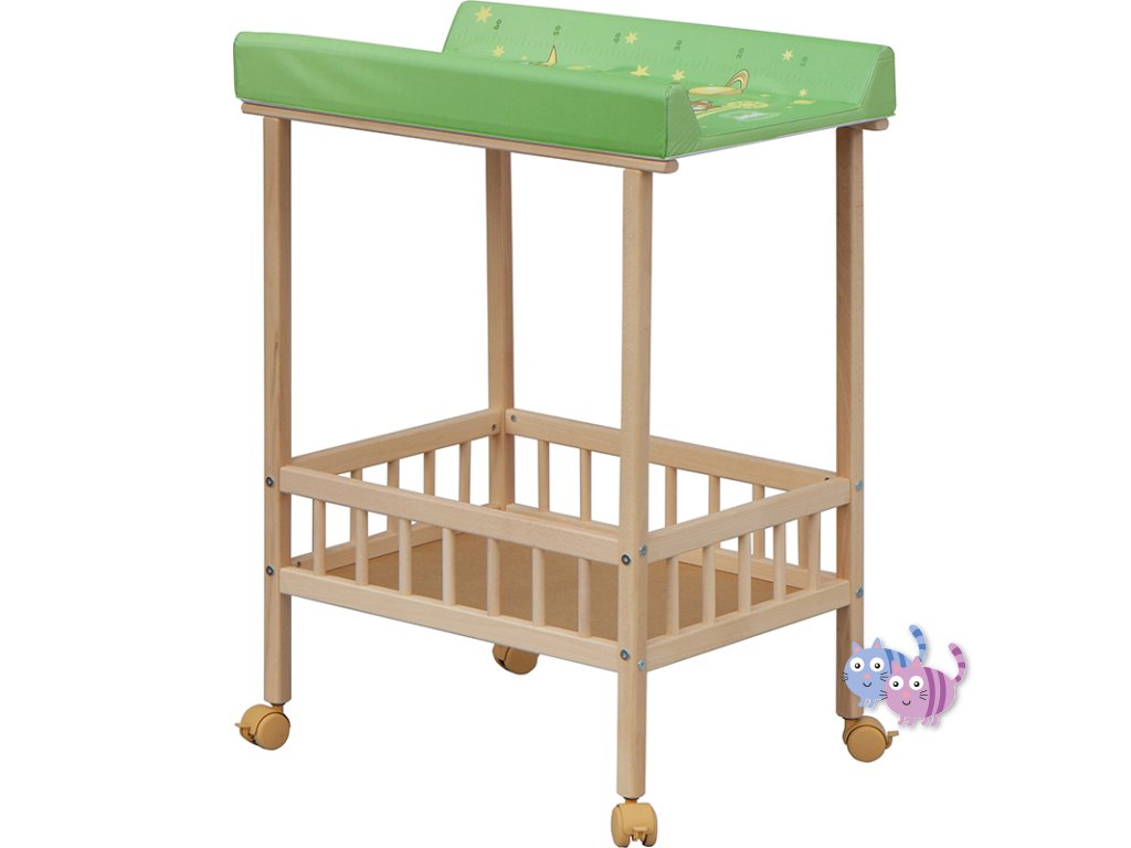 Praktický přebalovací pult se dvěmi policemi z HDF desky. Vrchní přebalovací pult z polyuretanu potažený omyvatelným PVC, vyztužený MDF deskou.