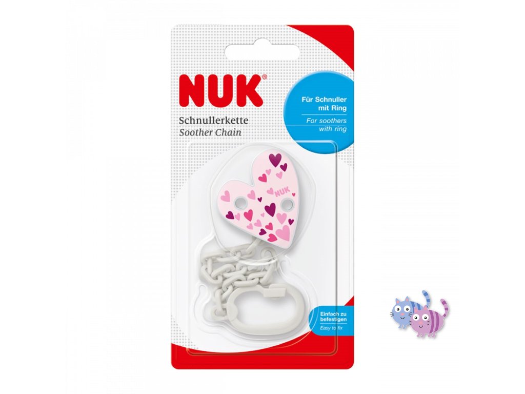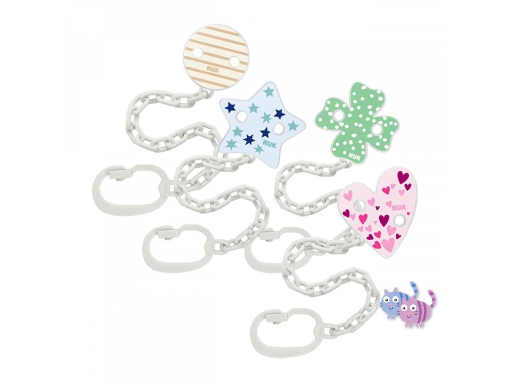 Veselý, barevný řetízek na dudlík NUK, je skvělým pomocníkem pro miminka i rodiče. Nenahraditelný zvláště během cestování a procházek. Díky sponě dudlík nespadne na zem a nezašpiní se, a neztratí se. Má jednoduché použití a je vyroben tak, aby se dal připnout k dětskému oblečení. Pestré barvy a veselé obrázky dítě zaujmou. Určeno pro děti od prvních dnů života.
