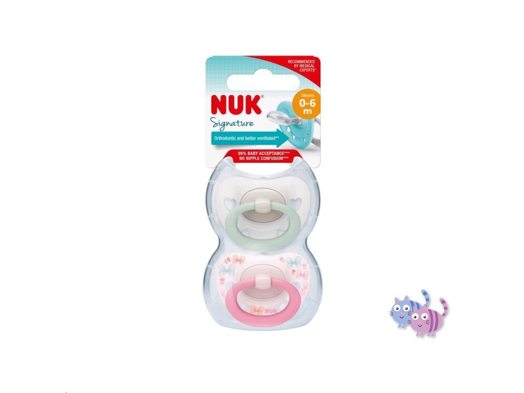 Kojenecký dudlík NUK Signature 0-6 měsíců. Dudlík má krásný barevný obrázek. Ortodontický tvar podporuje vývoj celé ústní dutiny dítěte. Dudlík je vylepšený a má ještě plošší tvar. Je vyroben z vysoce kvalitního plastu a silikonového dudlíku. Náustní kryt a kroužek jsou vyrobeny z polypropylenu a neobsahují BPA. Výhodou silikonu je to, že je bez zápachu a lehce se čistí. Neobsahuje BPA. Velikost 1 (0-6 měsíců). Všechny NUK dudlíky jsou pravidelně testovány a sledovány nezávislými instituty. V balení 2 kusy.