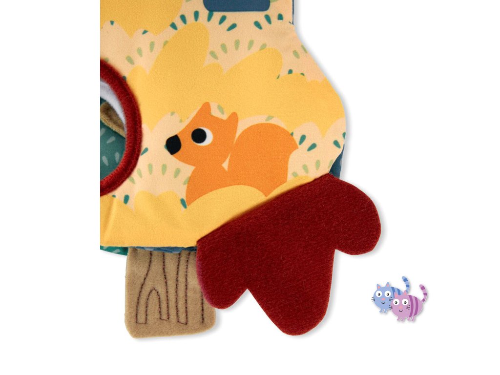 Podzim: Zahrnuje 2 veverky v kresbě a chlopeň listů, přes které lze vykouknout.